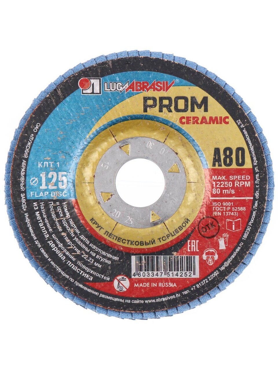 Круг лепестковый торцевой для УШМ LugaAbrasiv КЛТ1 — профессиональное решение для эффективной обработки металла и других материалов. Абразив (A) электрокорунд нормальный, зернистость A80, основа ткань, рабочий диаметр 125 мм, скорость 12250 об/мин и 80 м/с обеспечивают высокую производительность и долговечность. Prom Ceramic гарантирует надежный результат при шлифовке. Оптимальный выбор для мастерской и дачи.