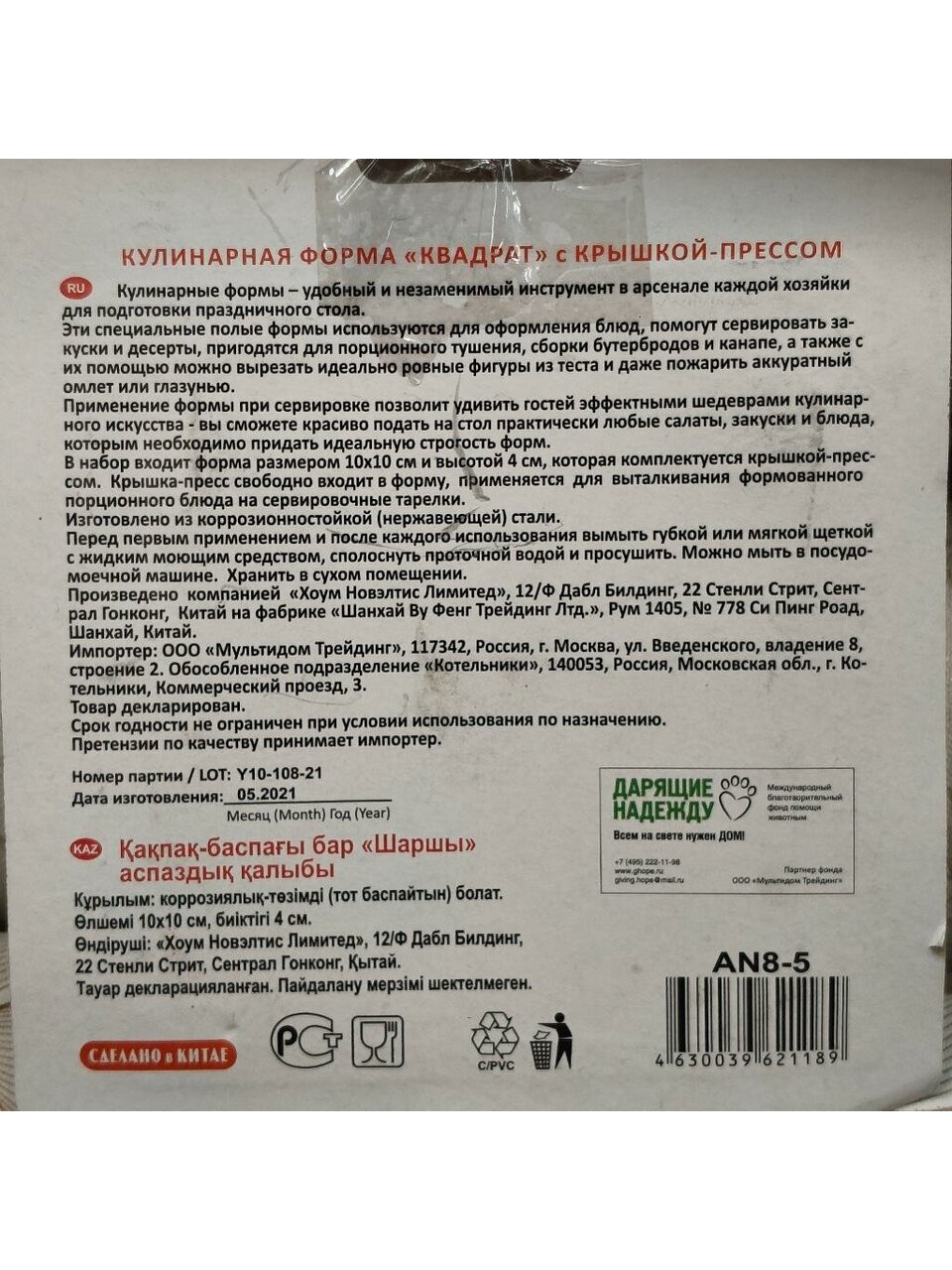 Вы можете приобрести «Форма кулинарная с крышкой-прессом, нержавеющая сталь, 10х10х4 см, Мультидом, Квадрат, AN8-5» и другие товары в нашем интернет-магазине в Старом Осколе по низким ценам и с бесплатным самовывозом.