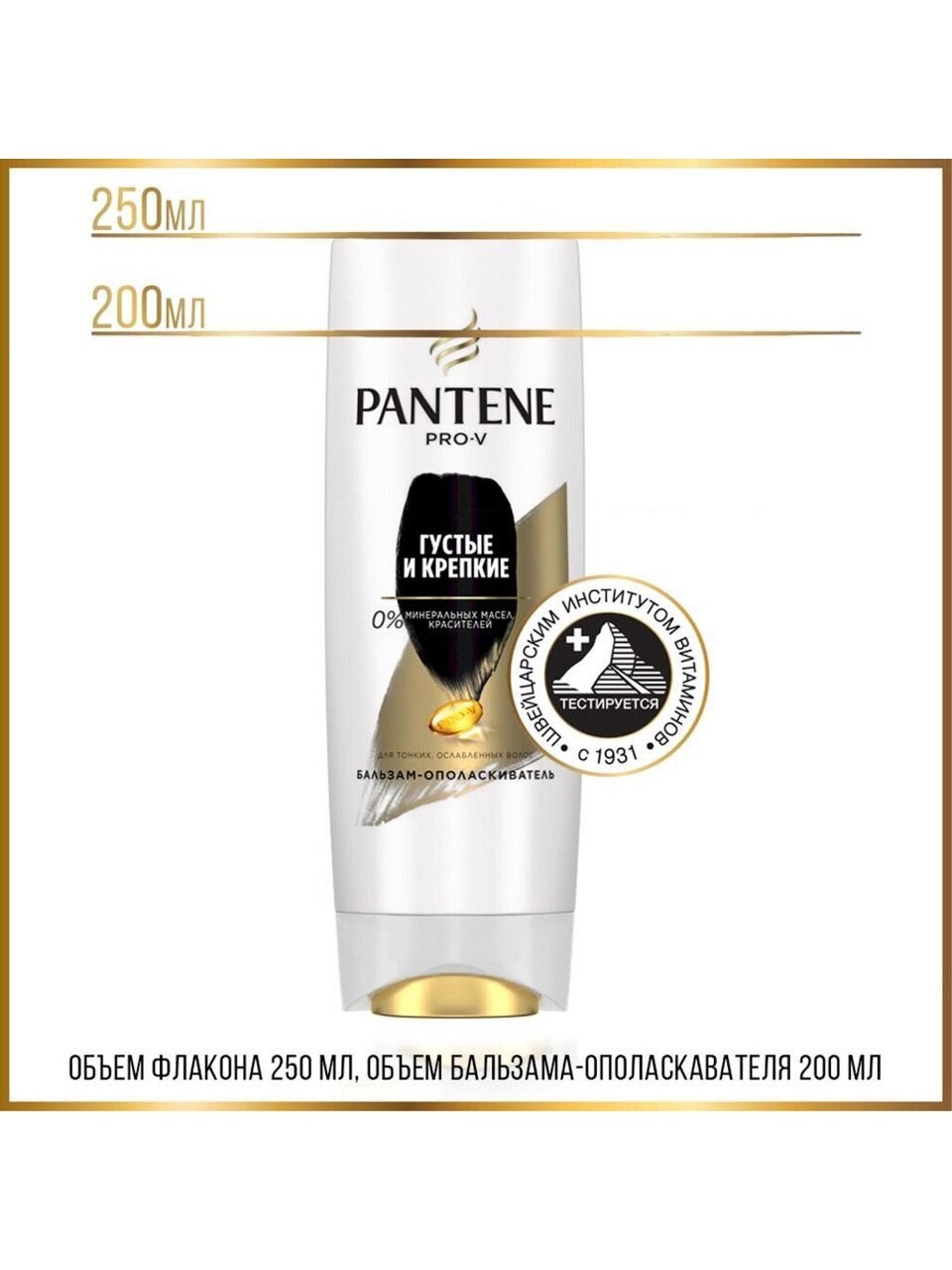 Бальзам-ополаскиватель Pantene Pro-V Густые и Крепкие идеально подходит для тонких, ослабленных волос. Благодаря уникальному комплексу Pro-V он насыщает волосы питательными веществами без утяжеления и способствует укреплению волос от корней до кончиков. Не содержит минеральных масел и красителей. Используйте бальзам-ополаскиватель каждый раз после мытья головы, чтобы превратить тонкие и ослабленные волосы в визуально более густые и сильные. Подходит для ежедневного применения и для окрашенных волос.
