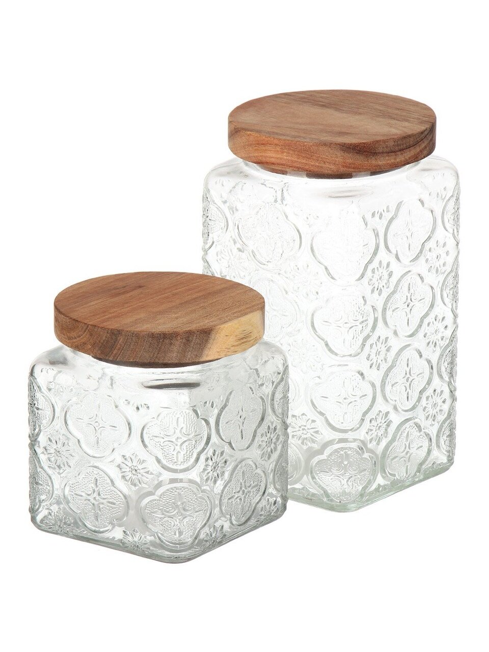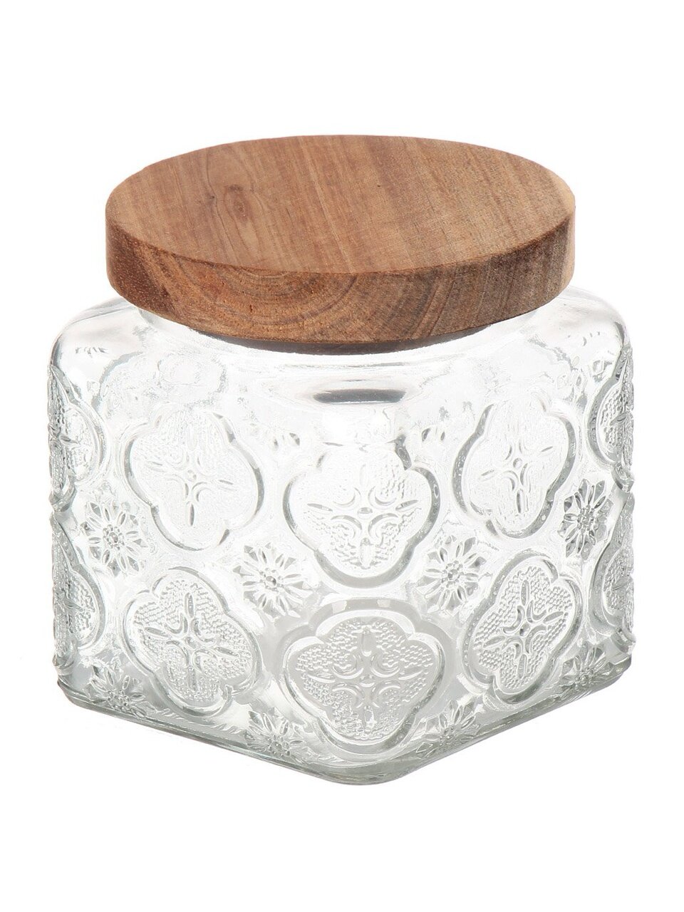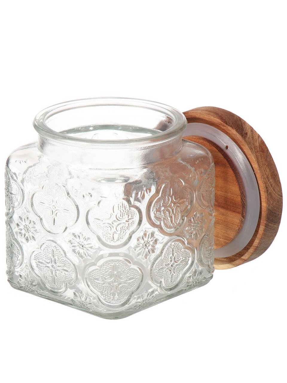 Объём — 0.5 л, размеры: 9.8×9.8×10.3 см. Квадратная форма, прозрачное стекло, герметичная деревянная крышка, рельефный дизайн. Подходит для хранения до 500 г сыпучих продуктов.
