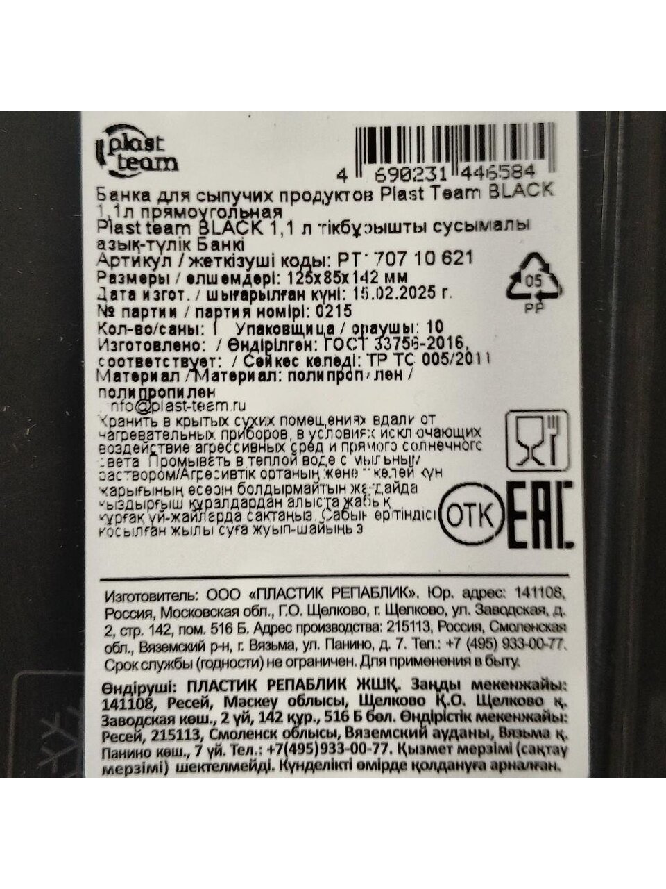 Вы можете приобрести «Банка для сыпучих продуктов, пластик, 1.1 л, 12.5х8.5х14.2 см, с крышкой, Plast team, Black, PT170710621» и другие товары в нашем интернет-магазине в Коврове по низким ценам и с бесплатным самовывозом.