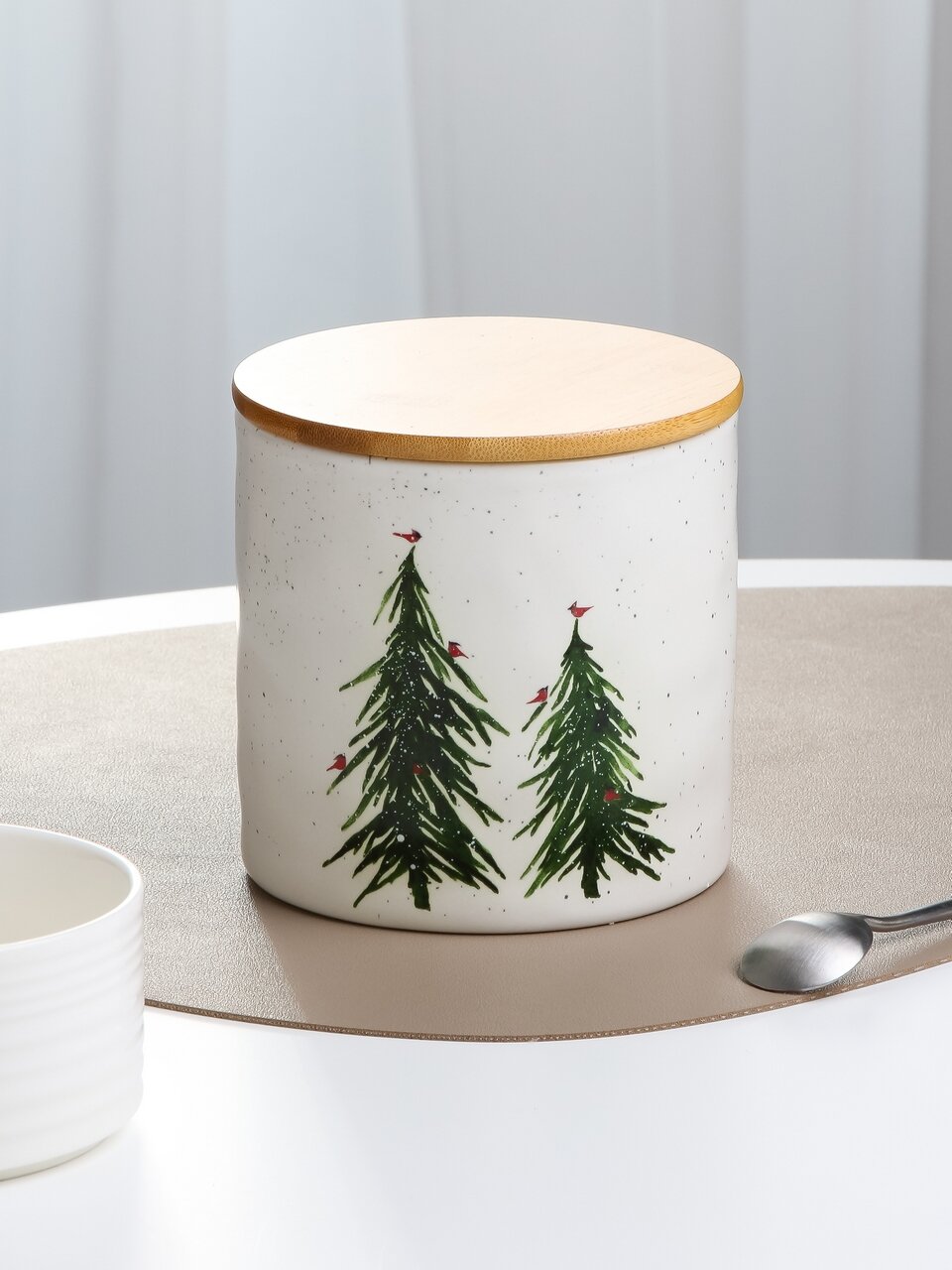 - Оптимальный объём 1 литр, прочная керамика и натуральная бамбуковая крышка с уплотнителем — защита от влаги и запахов, размеры 12.2×12 см.