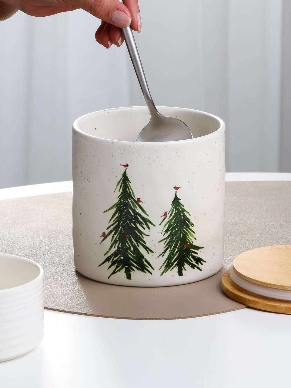 Банка для сыпучих продуктов 1 л с крышкой из бамбука — идеальный выбор для хранения сахара, соли, специй, орехов и других ингредиентов. Благодаря натуральной керамике, продукты не впитывают посторонние запахи и дольше остаются свежими. Бамбуковая крышка с силиконовым уплотнителем плотно закрывается, защищая содержимое от влаги и насекомых. Если вы ищете, как выбрать удобную и красивую банку для хранения круп или что лучше для подарка на Новый год — этот вариант сочетает экологичность, долговечность и праздничный декор.