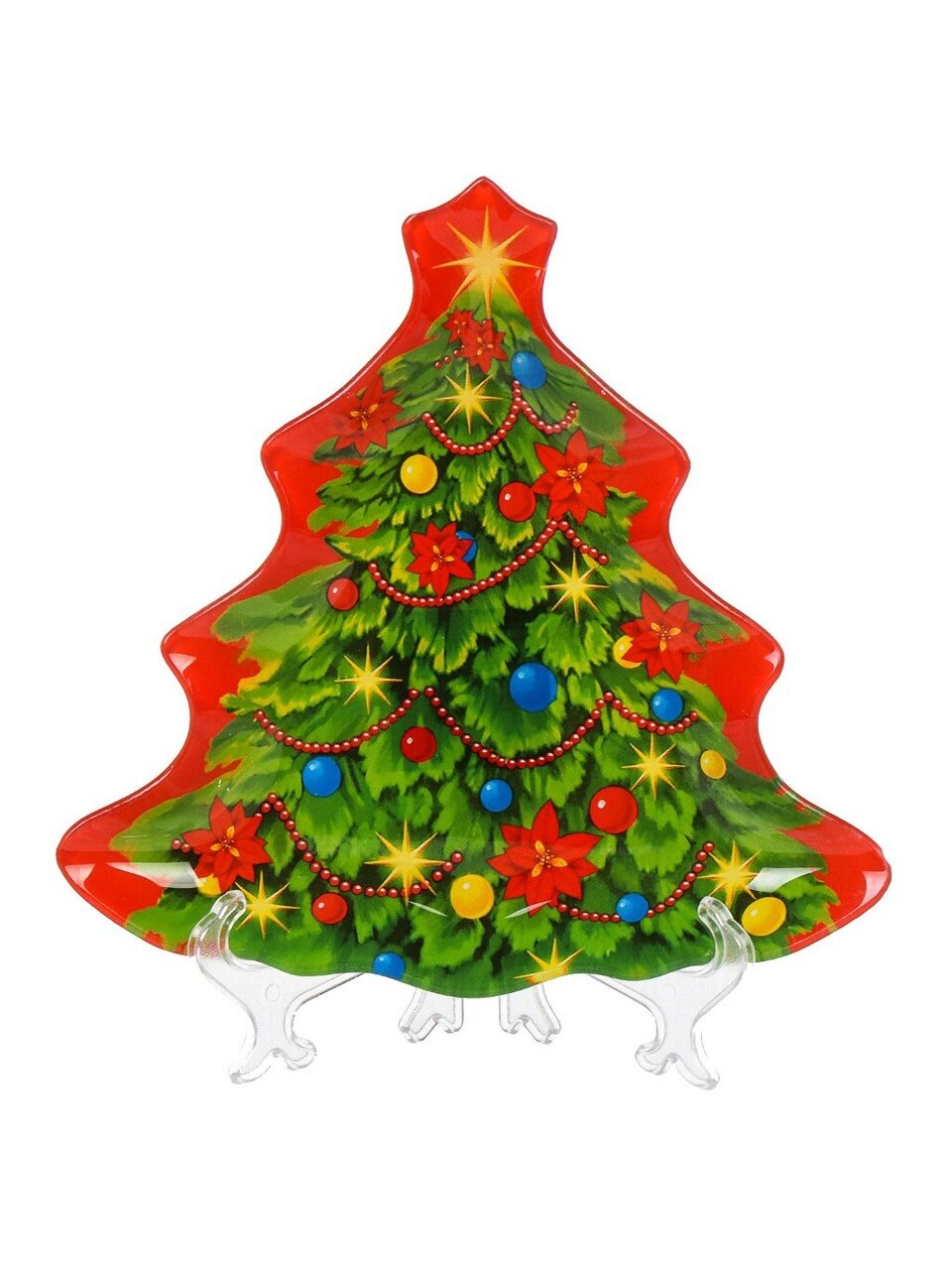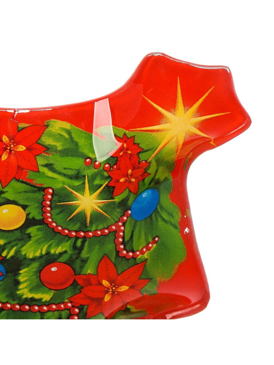 Размер 20.5×20.8 см, материал — прочное стекло, форма — ёлка, цвет — красно-зеленый с новогодним рисунком.