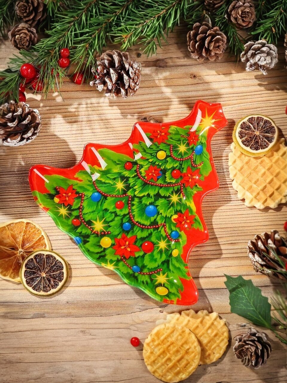 Блюдо из стекла в форме ёлки Daniks — это не просто праздничная сервировка, а удачное решение для тех, кто ищет, какое блюдо выбрать для новогоднего стола или что лучше для подачи закусок на праздник. Красно-зеленый рисунок устойчив к выцветанию, бортики защищают от проливов, а гигиеничное стекло не впитывает запахи и легко моется. По сравнению с пластиковыми аналогами, стеклянная ёлочка Daniks долговечнее, не царапается и подходит для горячих и холодных блюд.