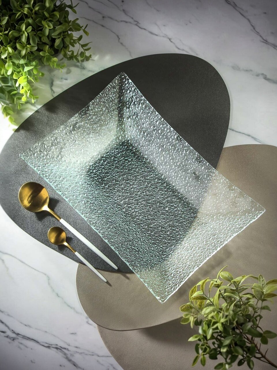 Стеклянное блюдо 22х32,5 см с рельефным декором: практичный выбор для закусок, нарезки и сервировки на праздник или каждый день.