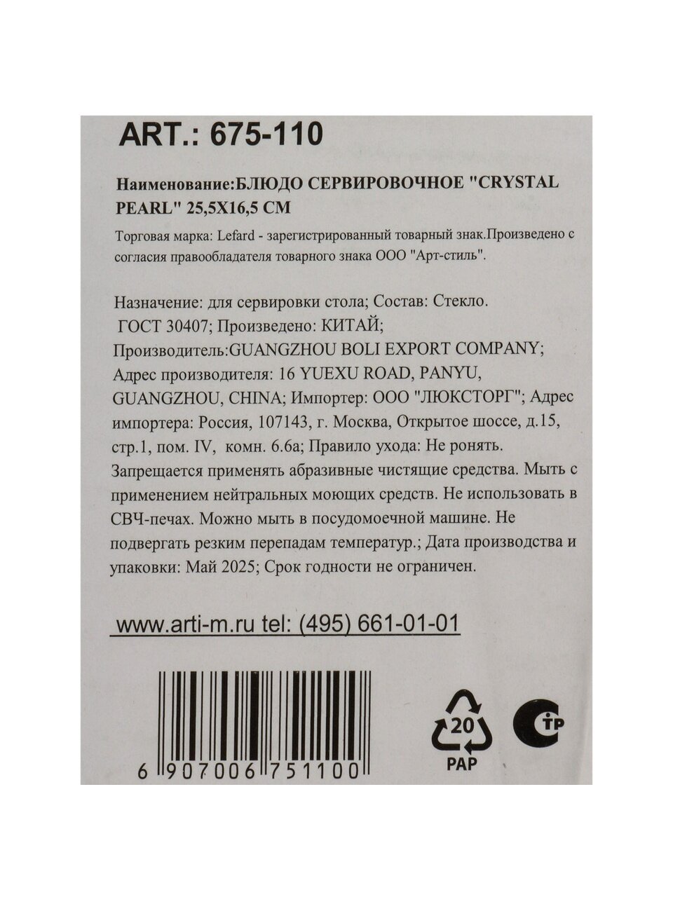 Вы можете приобрести «Блюдо стекло, для сервировки, овальное, 16.5х25.5 см, Crystal Pearl, Lefard, 675-110» и другие товары в нашем интернет-магазине в Ельце по низким ценам и с бесплатным самовывозом.