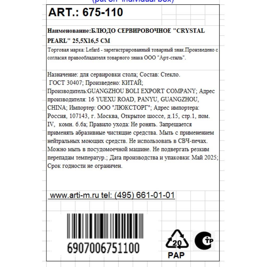 Вы можете приобрести «Блюдо стекло, для сервировки, овальное, 16.5х25.5 см, Crystal Pearl, Lefard, 675-110» и другие товары в нашем интернет-магазине в Борисоглебске по низким ценам и с бесплатным самовывозом.