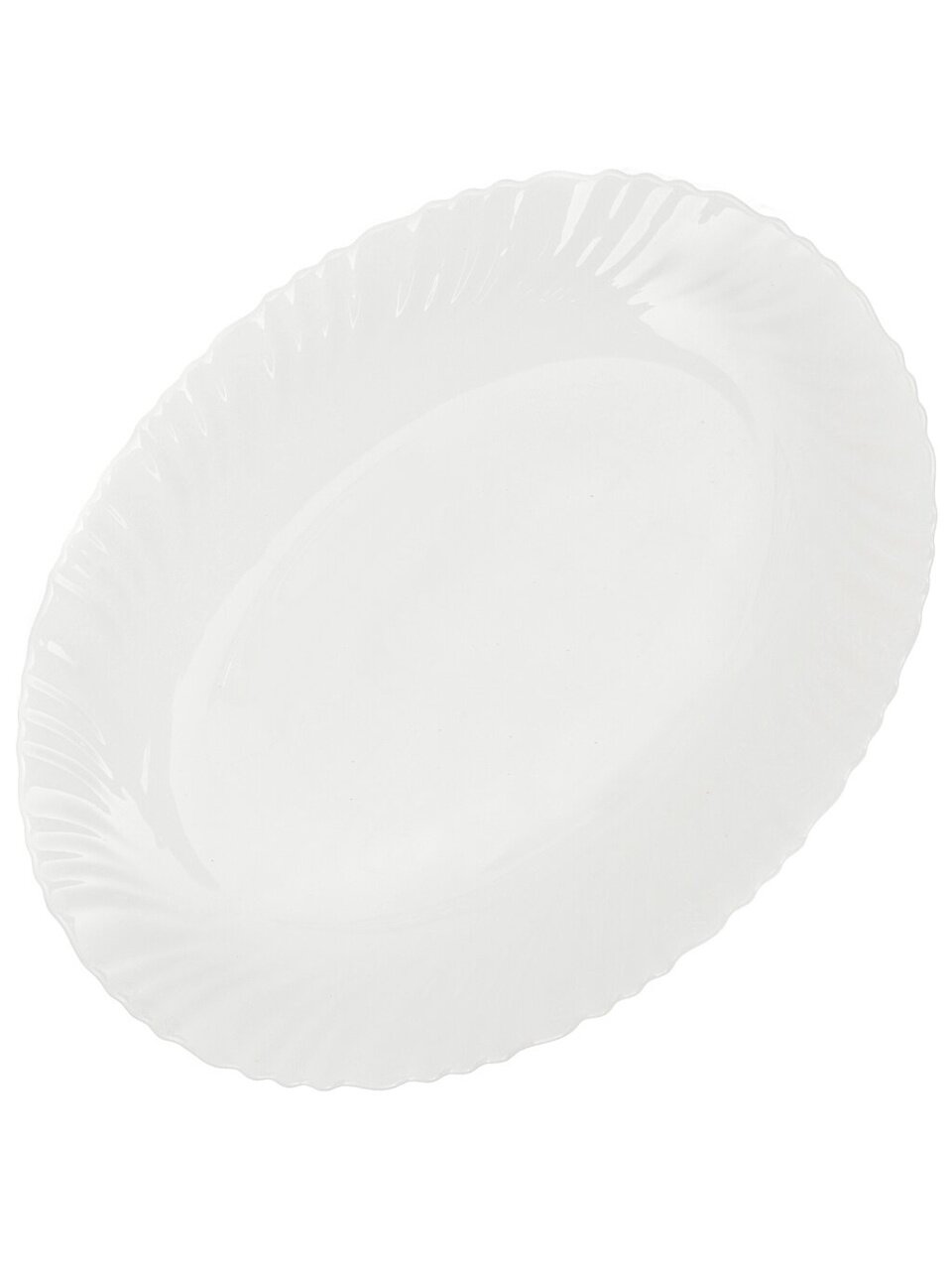 Материал — стеклокерамика, форма — овальная, диаметр — 30 см, цвет — белый, подходит для мытья в посудомоечной машине и использования в микроволновке.