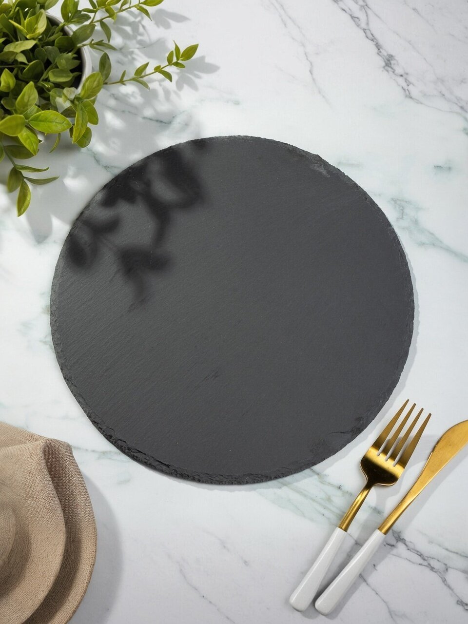 Блюдо из натурального камня 25 см: стильная сервировка для дома и дачи. Черный цвет, трендовый минимализм, идеальный выбор для нарезки и подачи закусок.