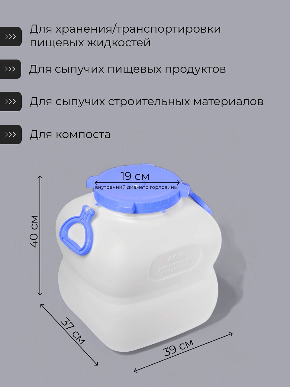 - Объем 40 литров, пищевой пластик — безопасное хранение воды, солений, круп и жидкостей