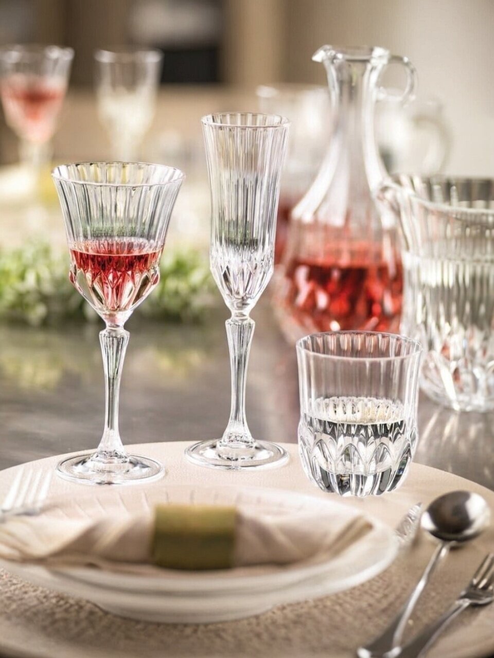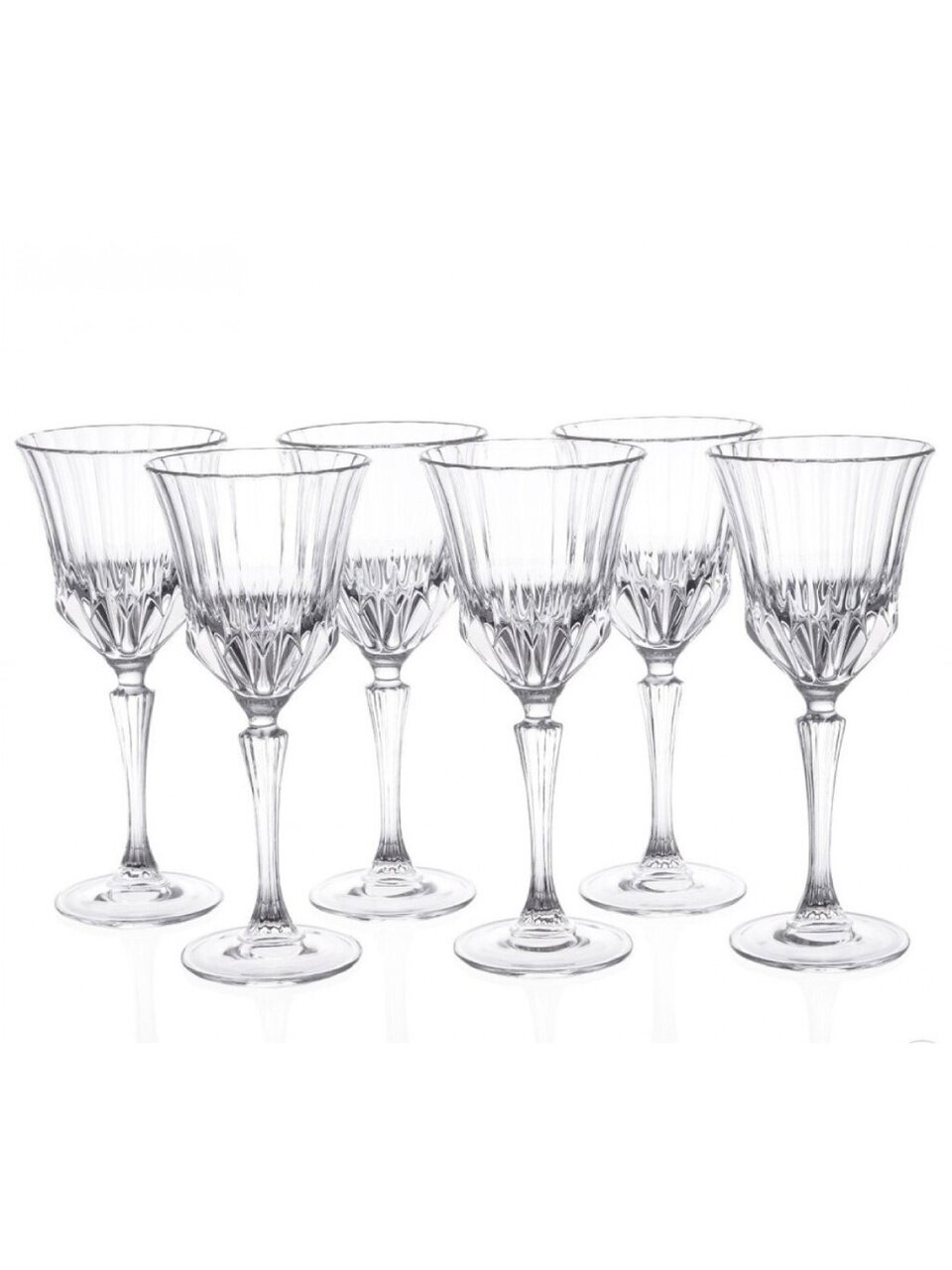 Бокалы изготовлены из прессованного хрустального стекла: оно прочнее, дольше сохраняет блеск, а рельефная текстура и узор делают сервировку более эффектной.