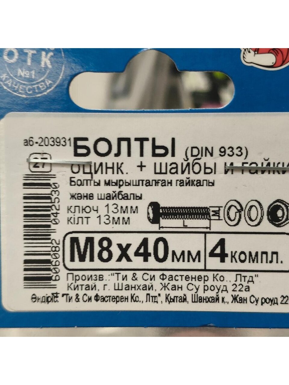 Вы можете приобрести «Болт DIN933, М8x40, 40 мм, оцинкованный, 4 шт, полная резьба, с гайкой и шайбой, 203931» и другие товары в нашем интернет-магазине в Таганроге по низким ценам и с бесплатным самовывозом.