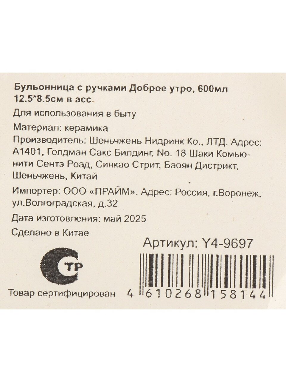 Вы можете приобрести «Бульонница керамика, 600 мл, 12.5х8.5 см, с ручкой, Доброе утро, Y4-9697, в ассортименте» и другие товары в нашем интернет-магазине в Шахтах по низким ценам и с бесплатным самовывозом.