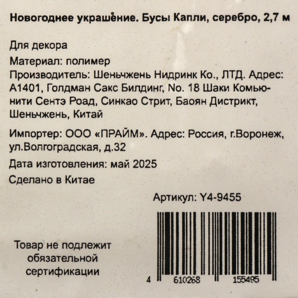 Бусы Капли серебро 2,7 м — стильное решение для декора, праздников и фотозон: длина 270 см, современный полимер, эффектный серебристый цвет, доступная цена.