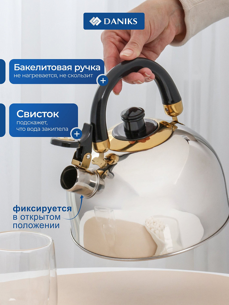 Чайник из нержавеющей стали Daniks 2.7 л со свистком — оптимальный выбор для дома и дачи: долговечность, безопасность, выгодная цена.