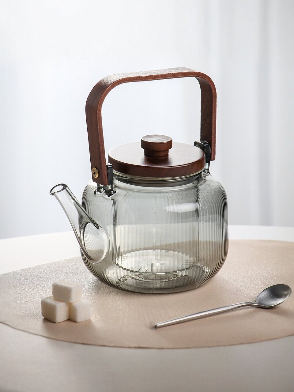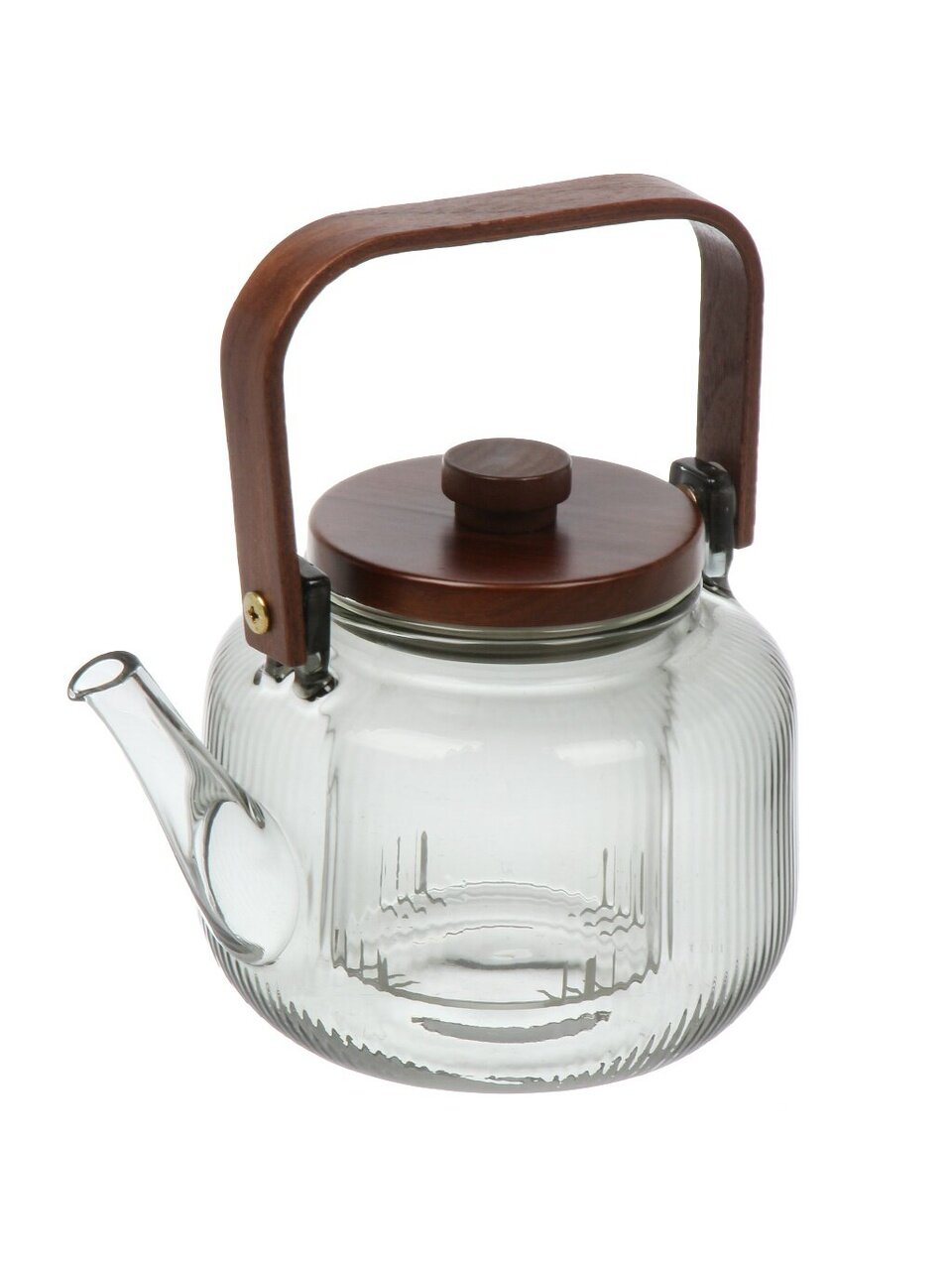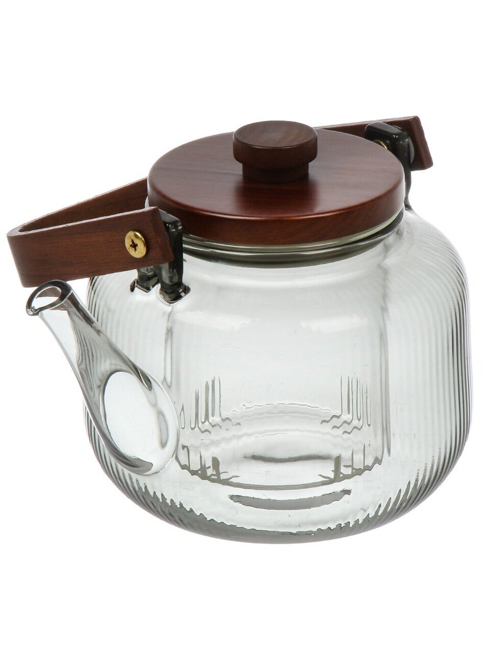 Стеклянный заварочный чайник 1 л с деревянной крышкой и ручкой Y4-9734 — стильное решение для дома и дачи: чистый вкус чая, удобство заваривания, эко-материалы.