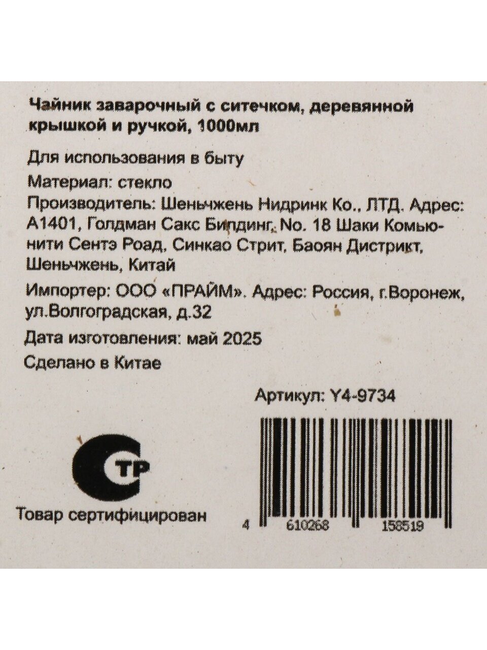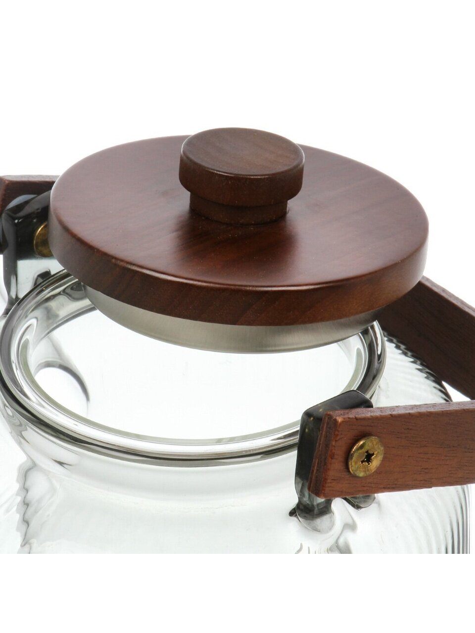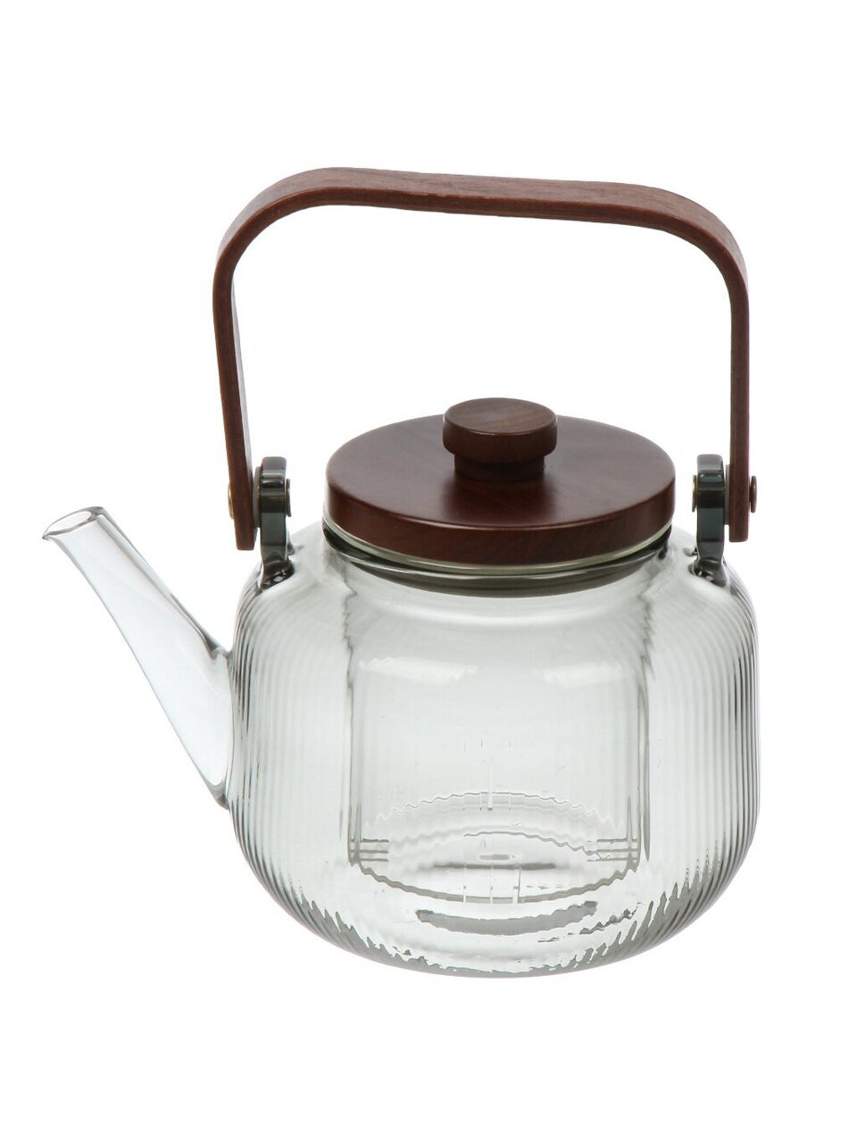 Стеклянный заварочный чайник 1 л с деревянной крышкой и ручкой Y4-9734 — стильное решение для дома и дачи: чистый вкус чая, удобство заваривания, эко-материалы.