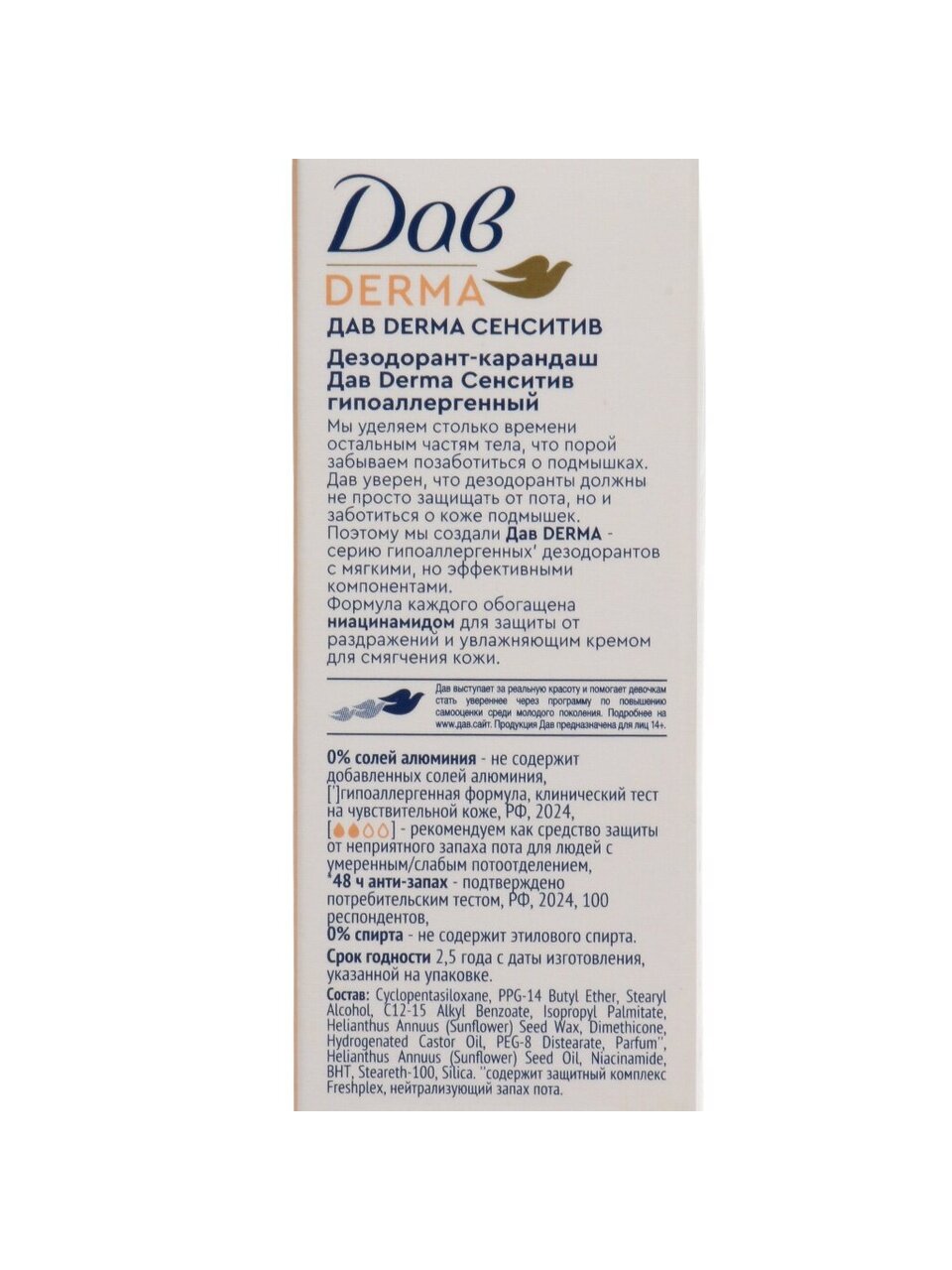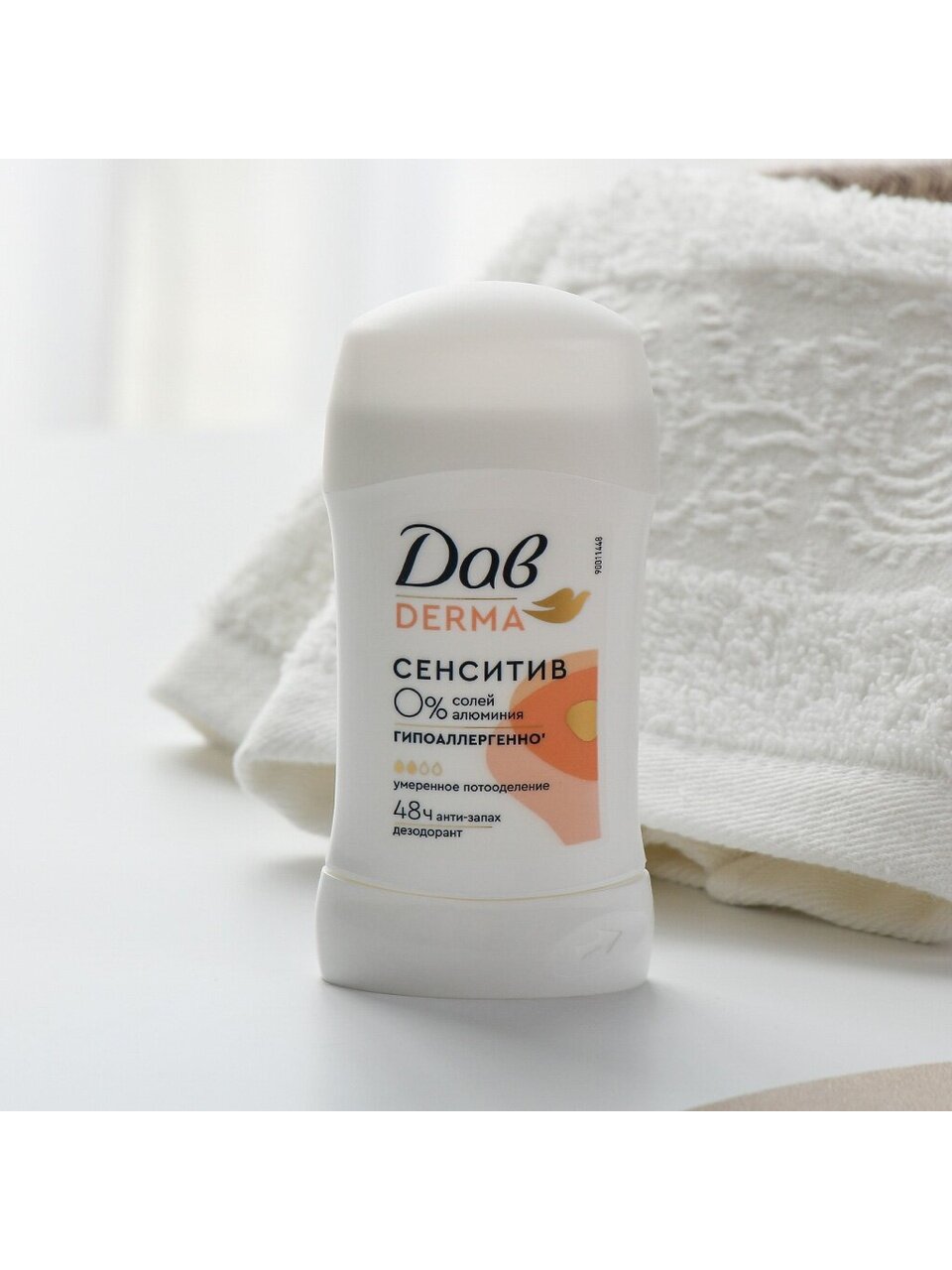 Гипоаллергенный дезодорант Dove Derma Sensitive для женщин: защита 48 часов, подходит для чувствительной кожи. Не содержит спирта, не вызывает раздражения.