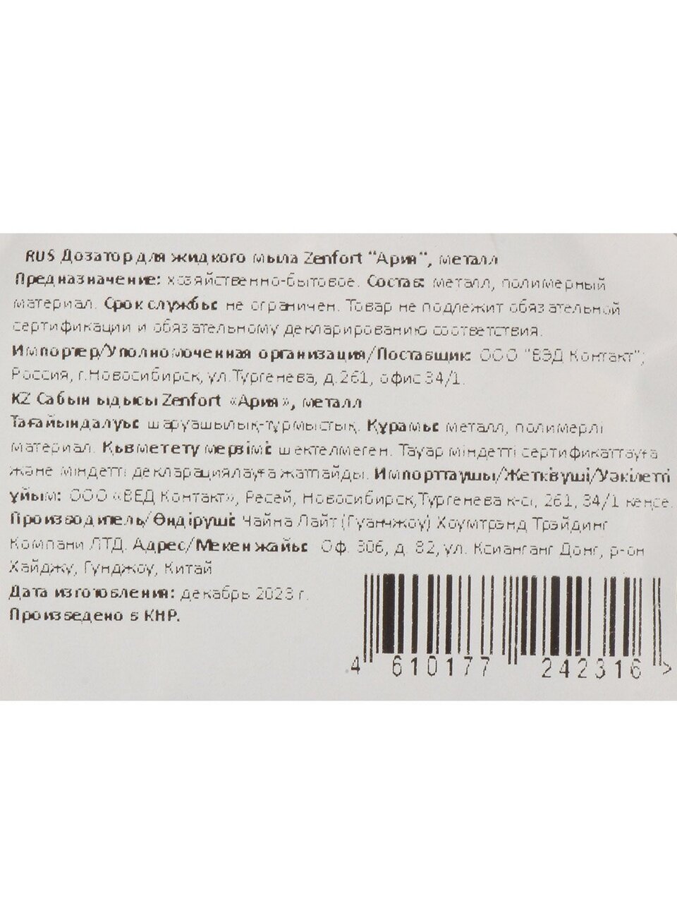 Удобный механизм подачи жидкости обеспечивает экономичный расход мыла, позволяя поддерживать чистоту и порядок в зоне умывальника. Благодаря оптимальному объему, дозатор подходит для использования как дома, так и в офисе или на даче, обеспечивая гигиену и комфорт для всей семьи или коллектива. Модель Zenfort Ария станет гармоничным дополнением к интерьеру и подчеркнет заботу о деталях.