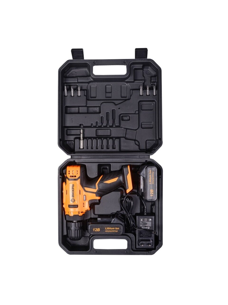 - Комплектация: аккумуляторная дрель-шуруповерт с аккумулятором 1шт, дополнительный аккумулятор 1 шт, бита 6 шт, адаптер-удлинитель для бит 1 шт, адаптер питания 1 шт, зарядное устройство 1 шт, паспорт (инструкция) 1 шт, кейс 1 шт.