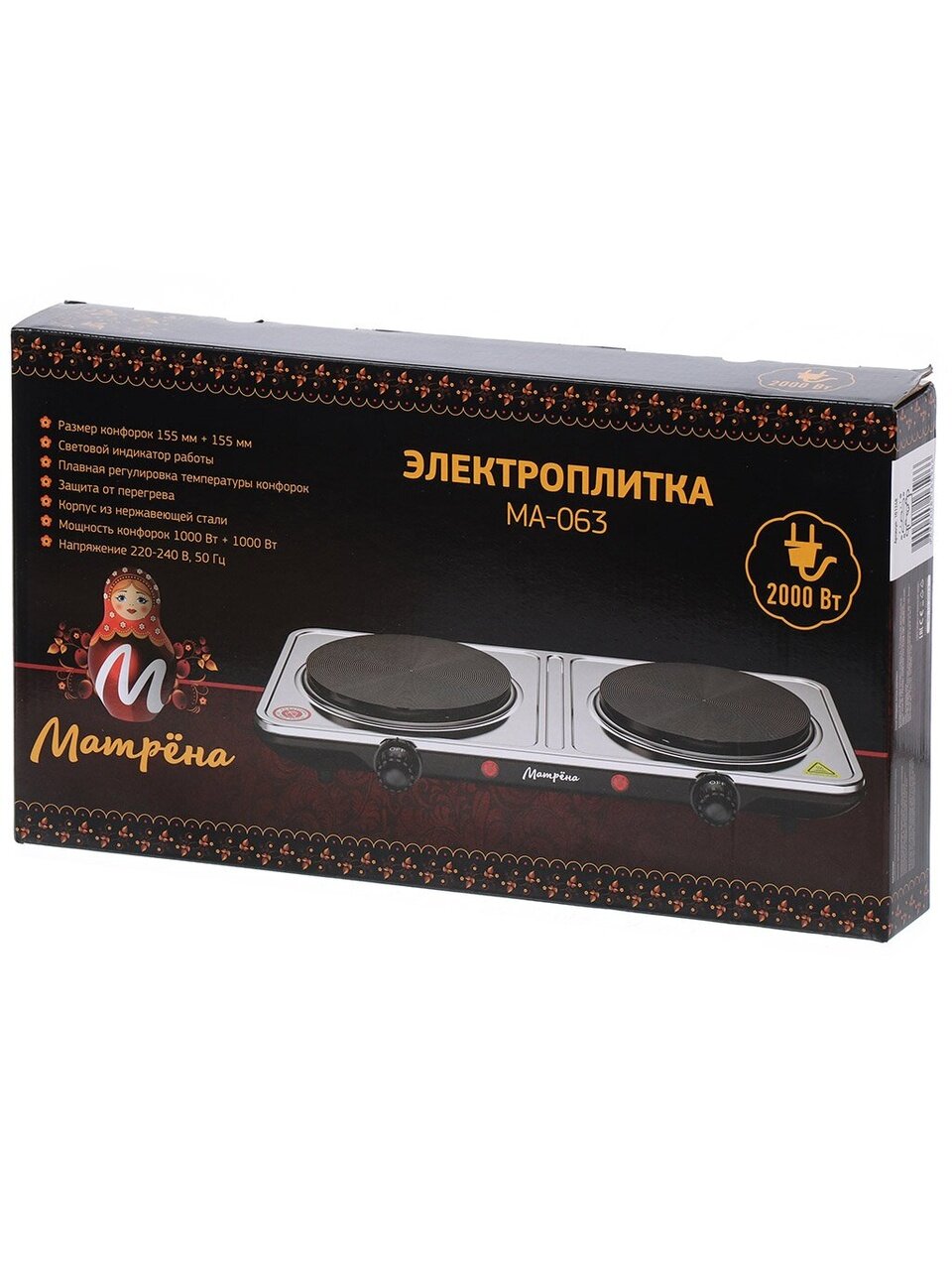 Вы можете приобрести «Плита электрическая Матрена, МА-063, 2000 Вт, 2 конфорки, диск, чугун, нержавеющая сталь» и другие товары в нашем интернет-магазине в Санкт-Петербургe по низким ценам и с бесплатным самовывозом.