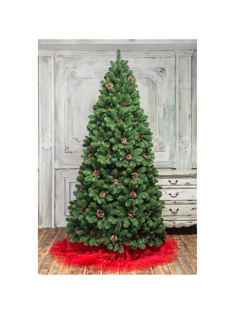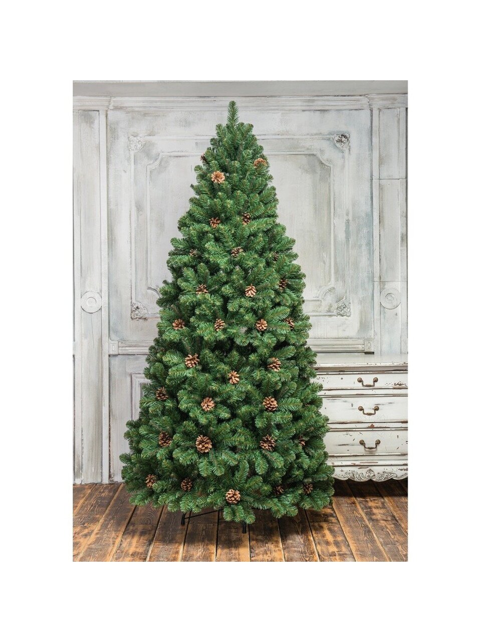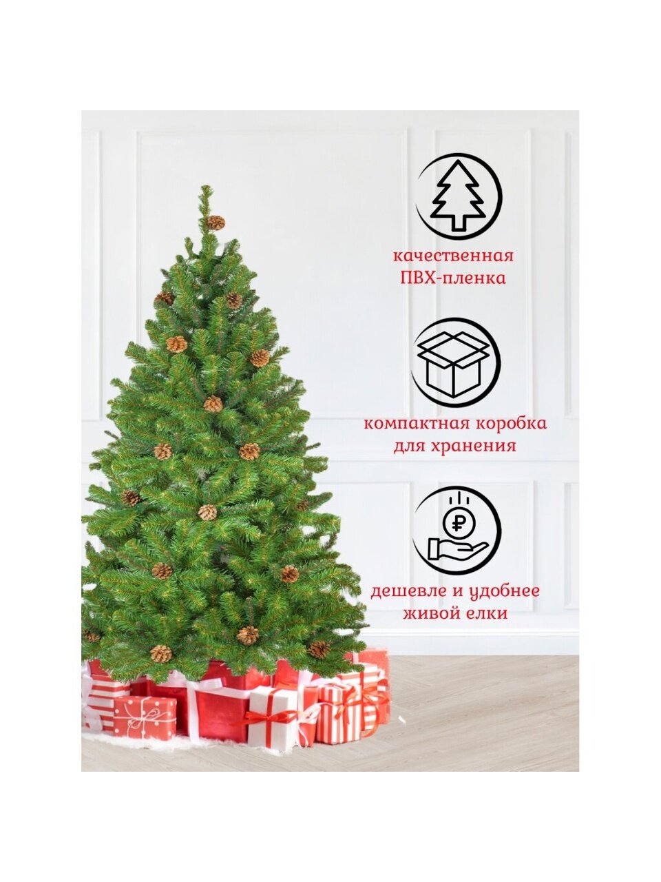 Если вы ищете, какую елку выбрать для подарка или как украсить дом к Новому году, обратите внимание на эту модель — она гармонично смотрится в любой комнате, а наличие шишек добавляет уюта и праздничности. По сравнению с аналогами на металлической подставке, конструкция более устойчива и прослужит не один сезон.