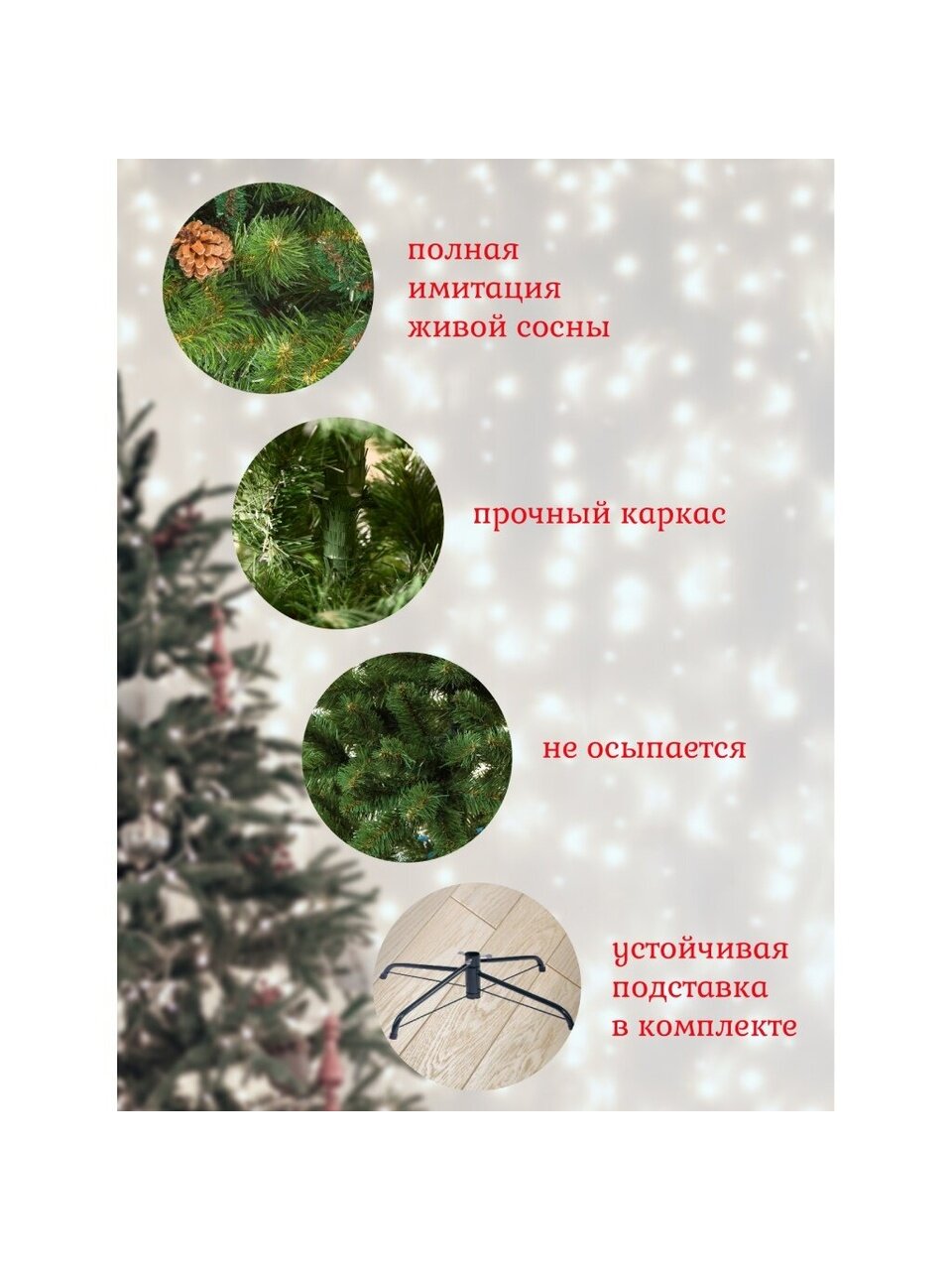 Хвоя выполнена из ПВХ-пленки (полимер), подставка — металлическая. Это обеспечивает долговечность, безопасность и устойчивость елки.