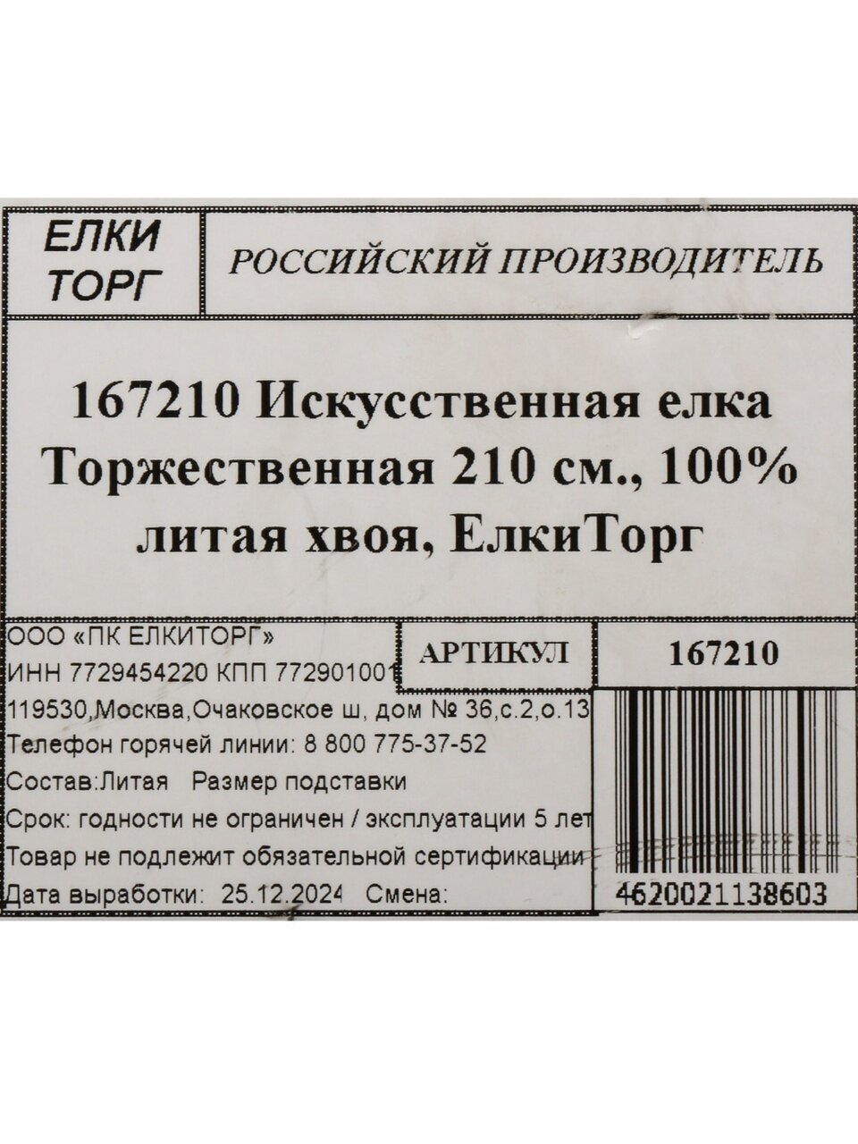Подарите себе и близким атмосферу настоящего праздника — оформите заказ на напольную елку 210 см «Торжественная» с выгодной доставкой и официальной гарантией от ЕлкиТорг.