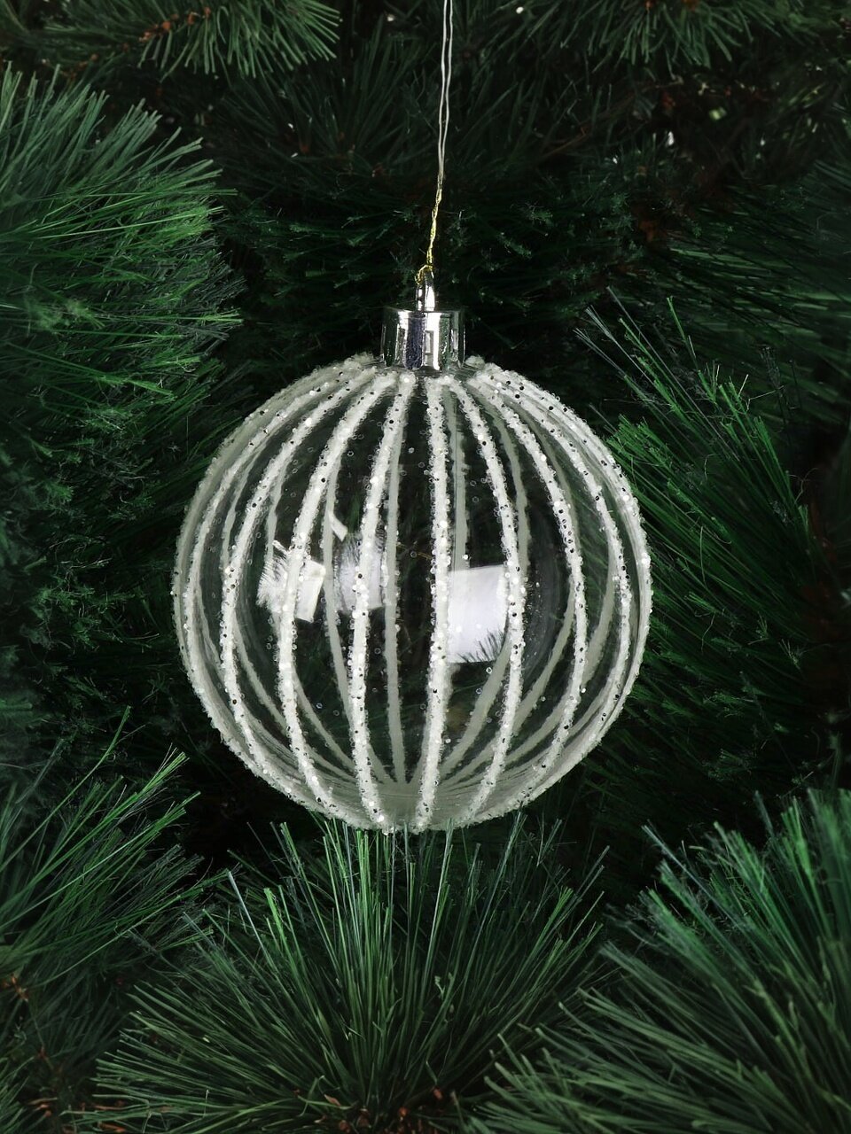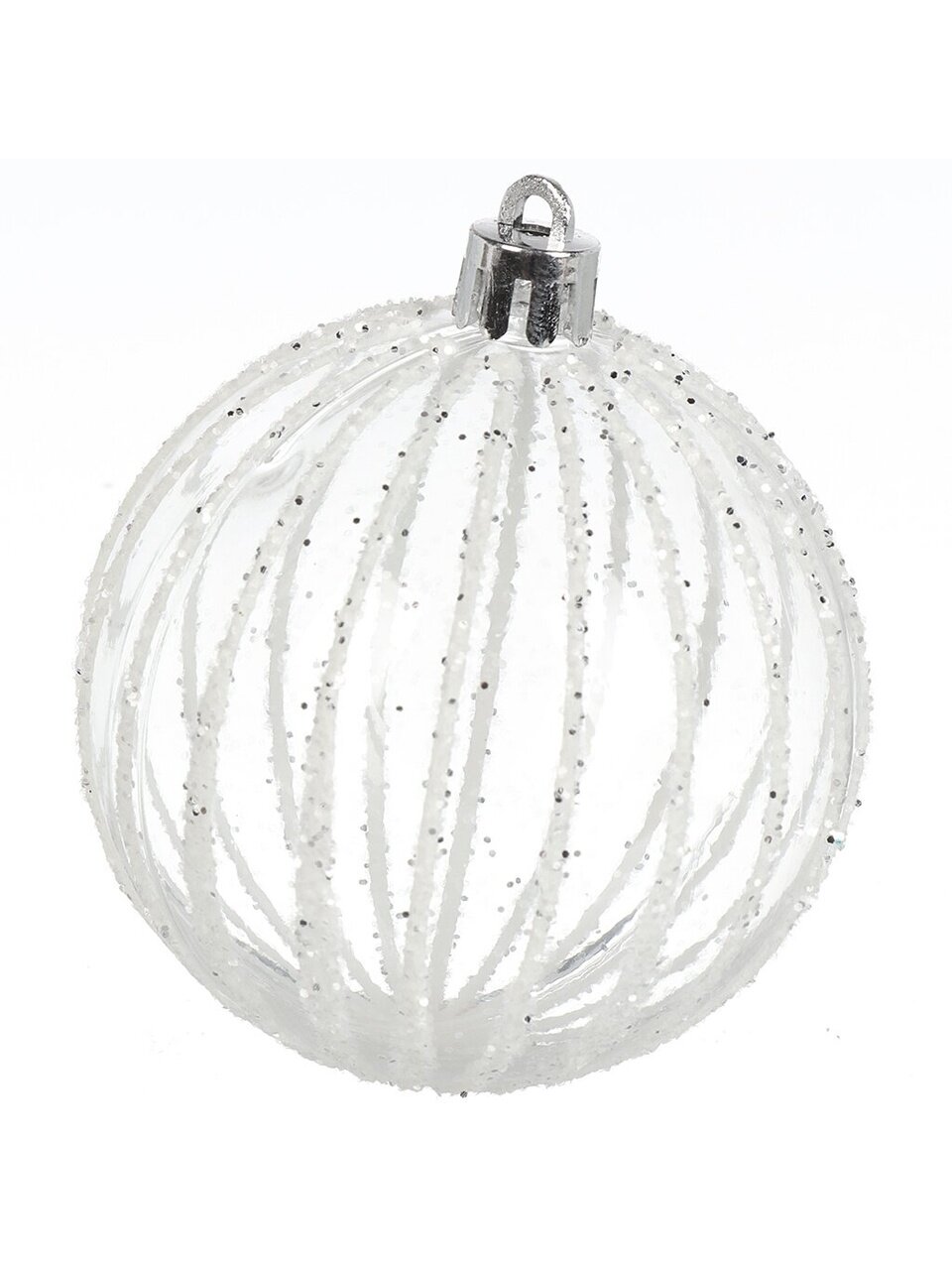 Диаметр каждого шара — 7 см, цвет прозрачный с серебряным блеском, универсальный для любого стиля новогоднего декора.