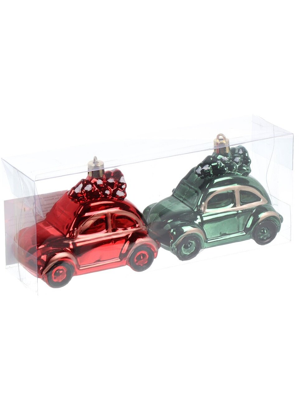 В наборе две машинки размером 10x7.5 см. Высота каждой игрушки — 10 см, подходят для стандартных и уличных елок.