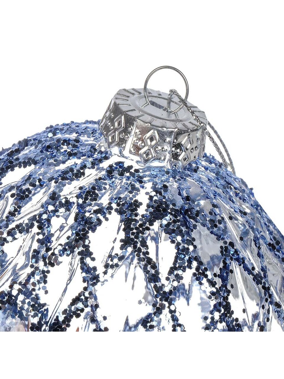Шар выполнен из стекла, диаметр — 10 см. Прозрачное основание с синим покрытием и блестками, крепится на подвеске.