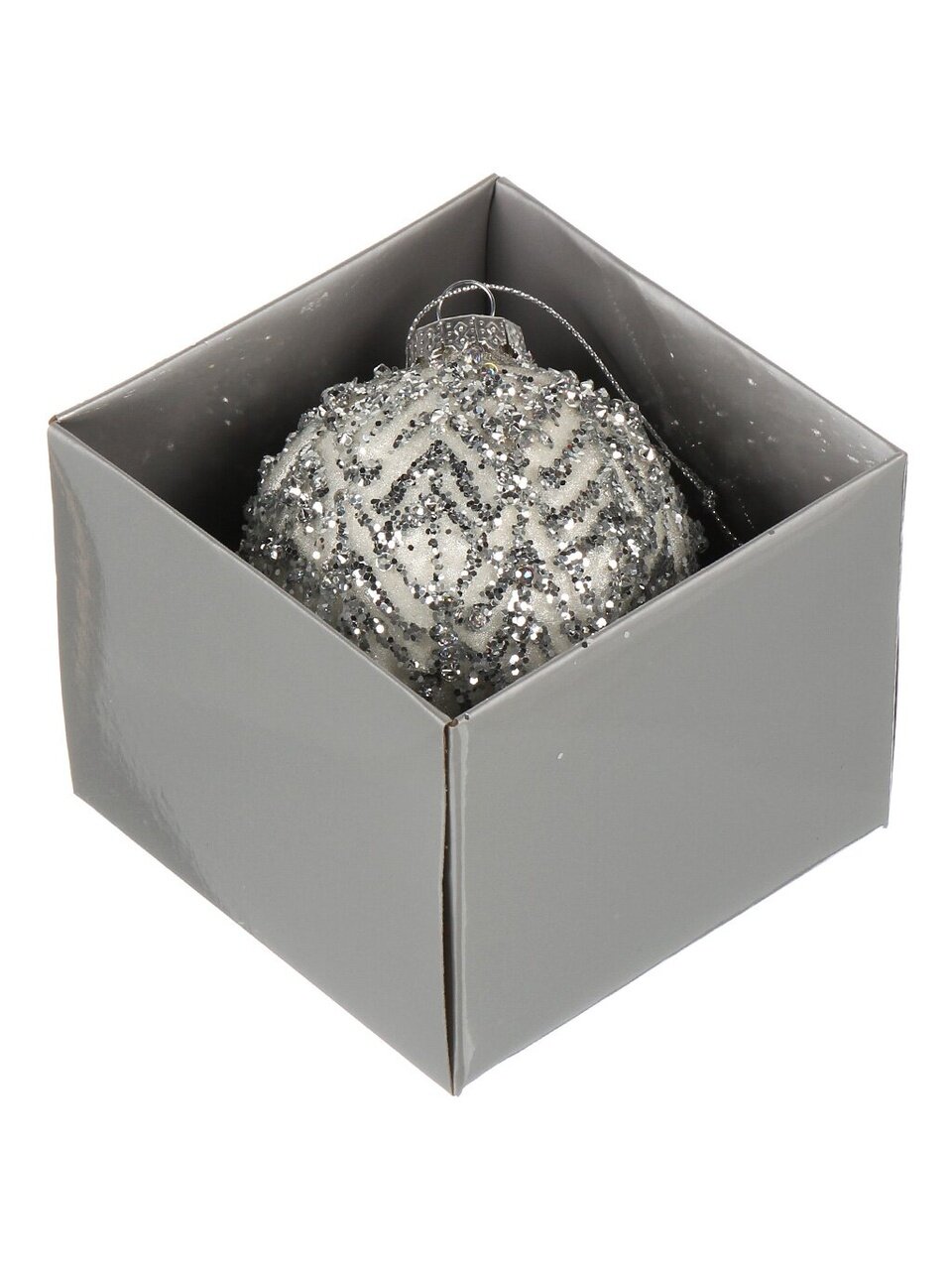 Да, шар поставляется в индивидуальной коробке, что делает его отличным вариантом для подарка на Новый год, корпоратив или семейное торжество. Цвет — белый, оформление — с серебряным листом, материал — стекло.