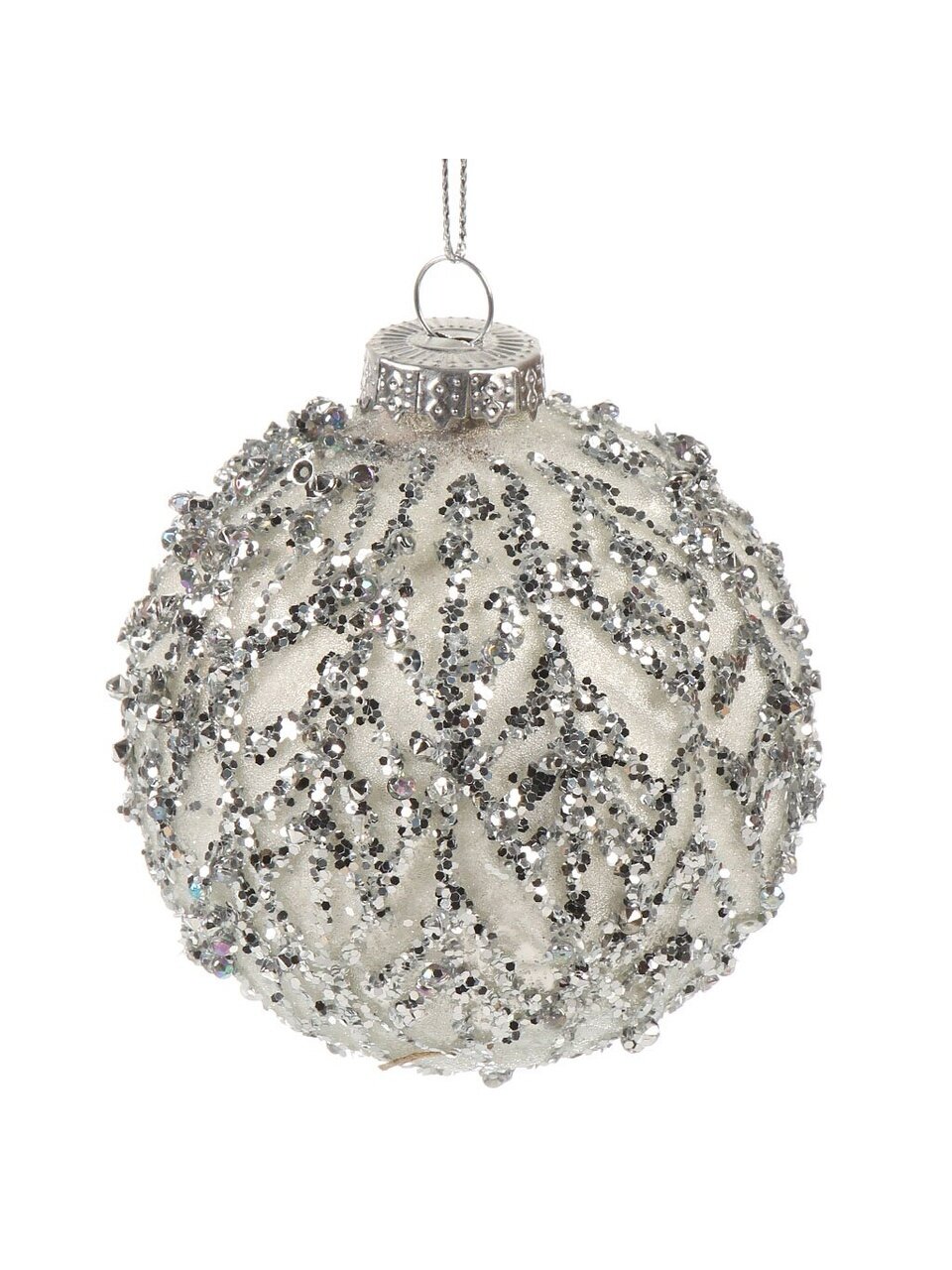 - Уникальное оформление: изысканный серебряный узор на белом стекле, ручная отделка с блестками для праздничного сияния