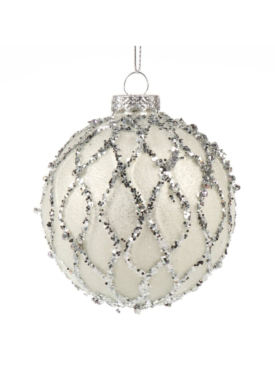 Шар выполнен из прочного стекла, имеет крепление на подвеске и покрытие с блестками. Не содержит подсветки, подходит для ручного размещения на елке.