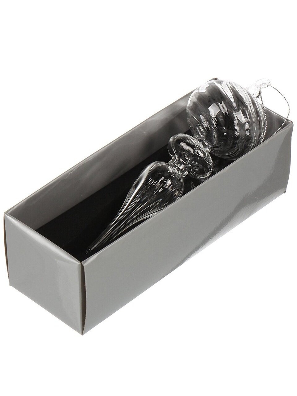 Украшение крепится на подвеске, подсветки нет. Высота — 18 см, материал — стекло, цвет — прозрачный.