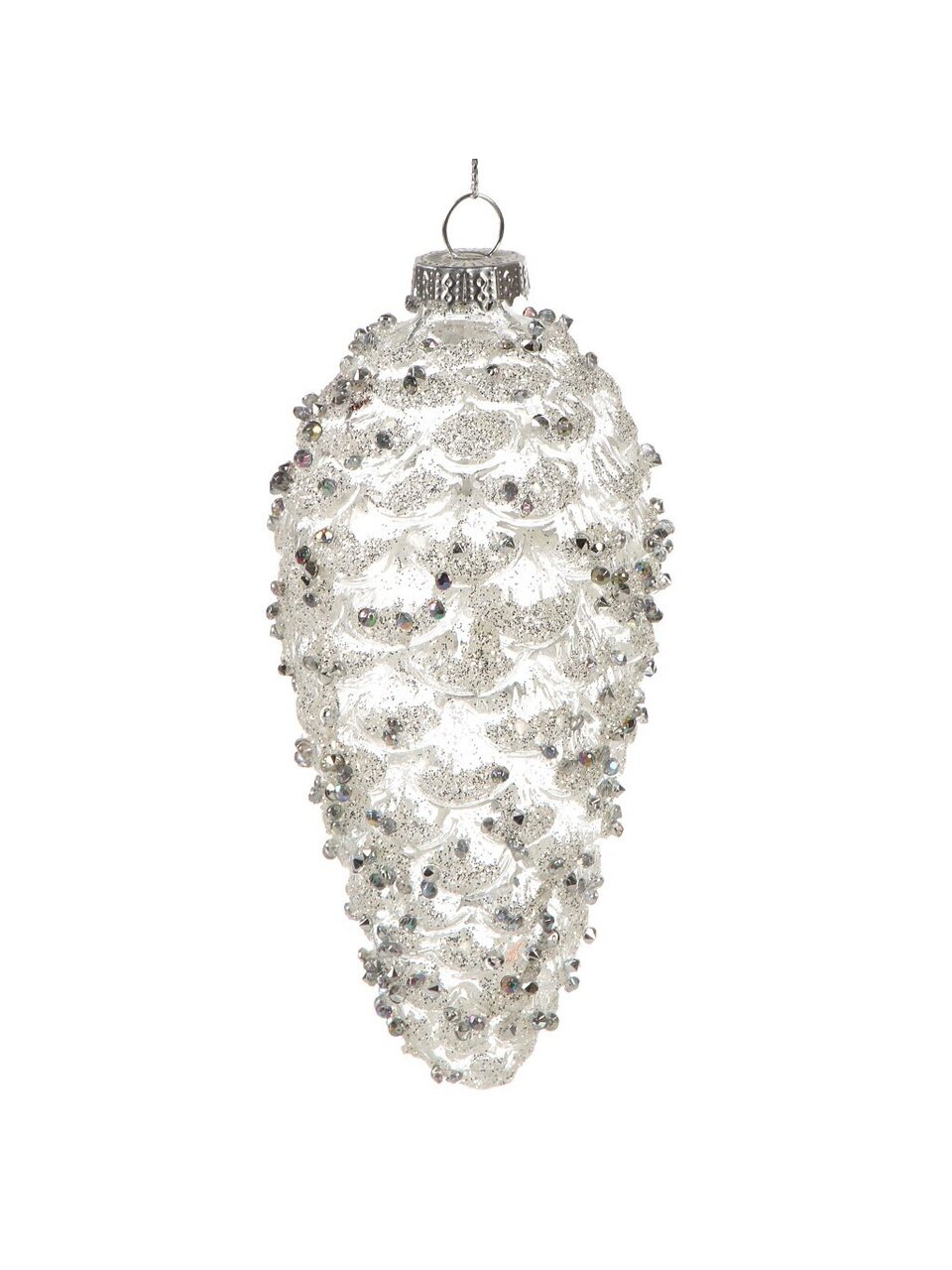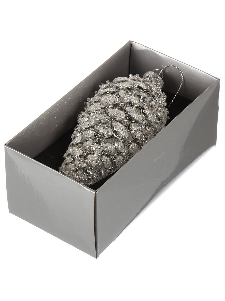 Елочное украшение «Шишка Серебристый лес», 14 см — стеклянная прозрачная игрушка с блестками: стильный акцент для новогоднего декора и оригинальный подарок.