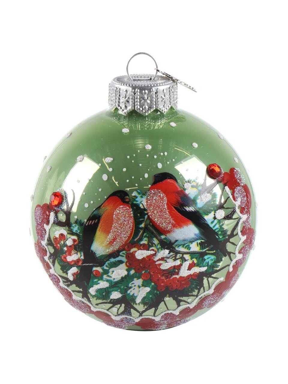 Елочный шар «Зимние птицы-2», 8 см: стекло с ручной росписью, подарочная упаковка — стильный новогодний декор и оригинальный подарок для дома или дачи.