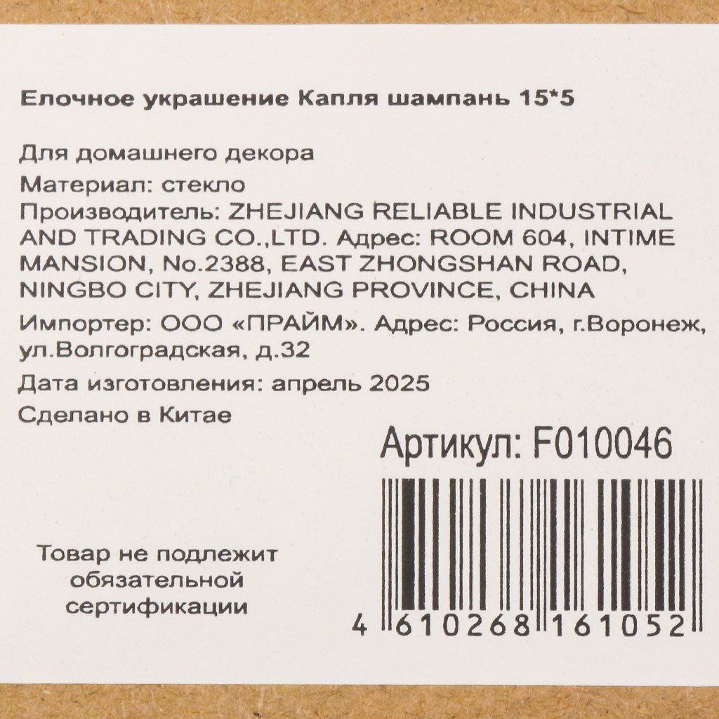 Елочное украшение Капля, шампань, 15х5 см, стекло, F010046