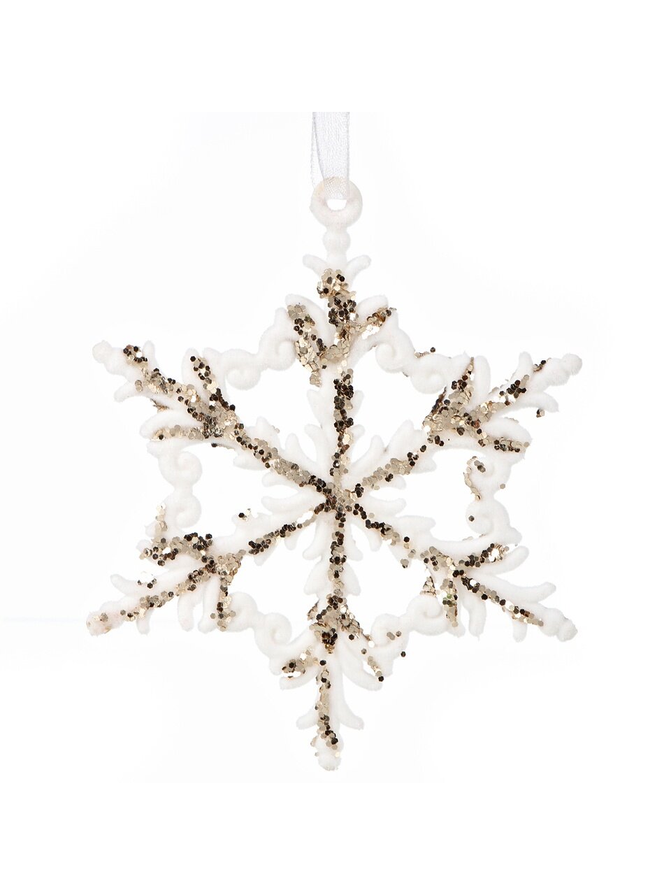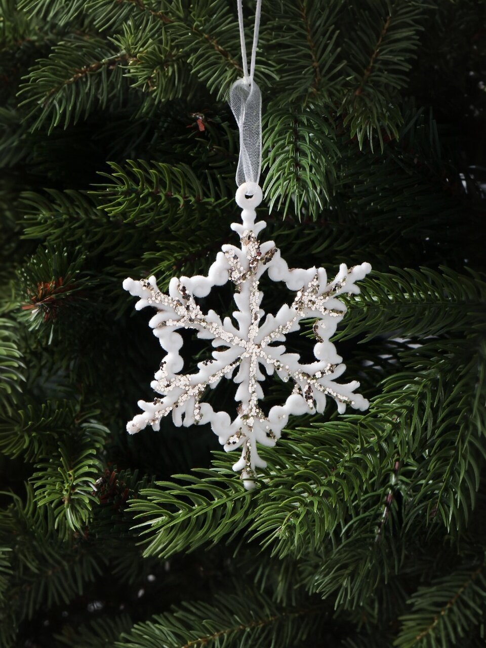 Елочное украшение в форме снежинки — идеальное решение для тех, кто ищет, какую игрушку выбрать для уличной или домашней ёлки. Благодаря материалу — пластик с флоком — изделие не бьётся, выдерживает перепады температур, подходит для декора на даче или в городской квартире. Белый цвет с золотым акцентом гармонирует с классическими и современными новогодними стилями, а блестящая поверхность привлекает внимание при любом освещении.