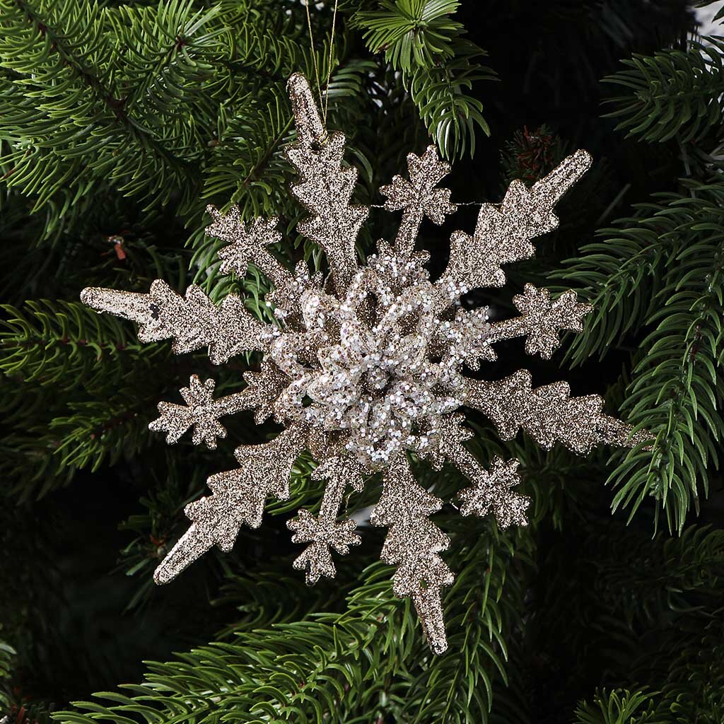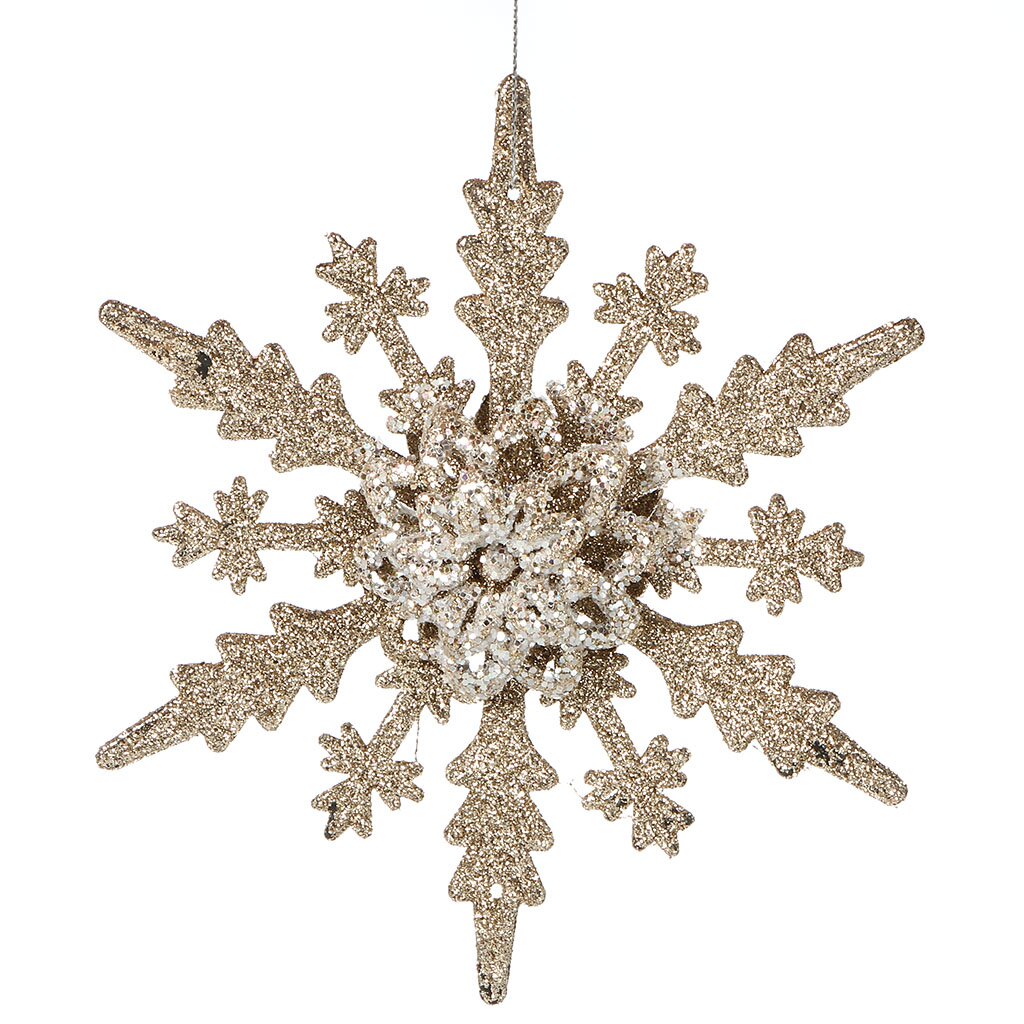 Эффектная снежинка из пластика 16 см цвета шампань: безопасное елочное украшение с блеском для стильного декора дома, дачи или подарка.