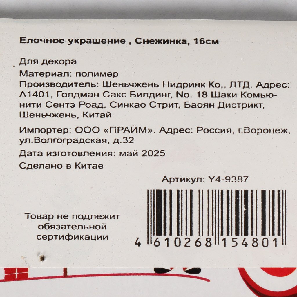 Украшение имеет диаметр 16 см, выполнено из пластика с блестками и рассчитано на использование как в помещении, так и на улице благодаря устойчивости к влаге и морозу.