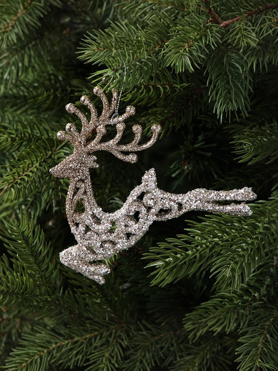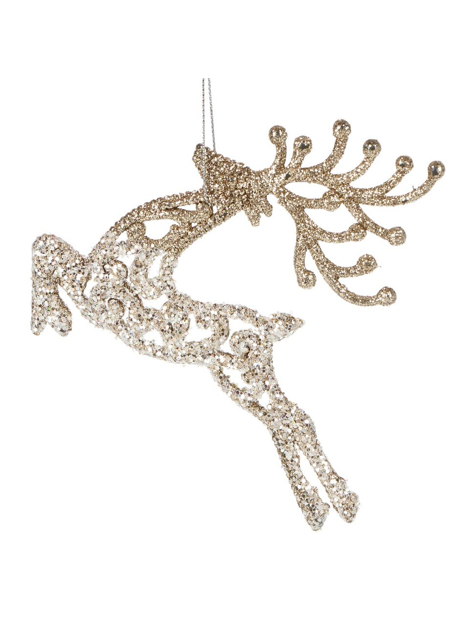 Высота 13 см, цвет шампань (золотой), покрытие с блестками, форма — олень, крепление на подвеске.