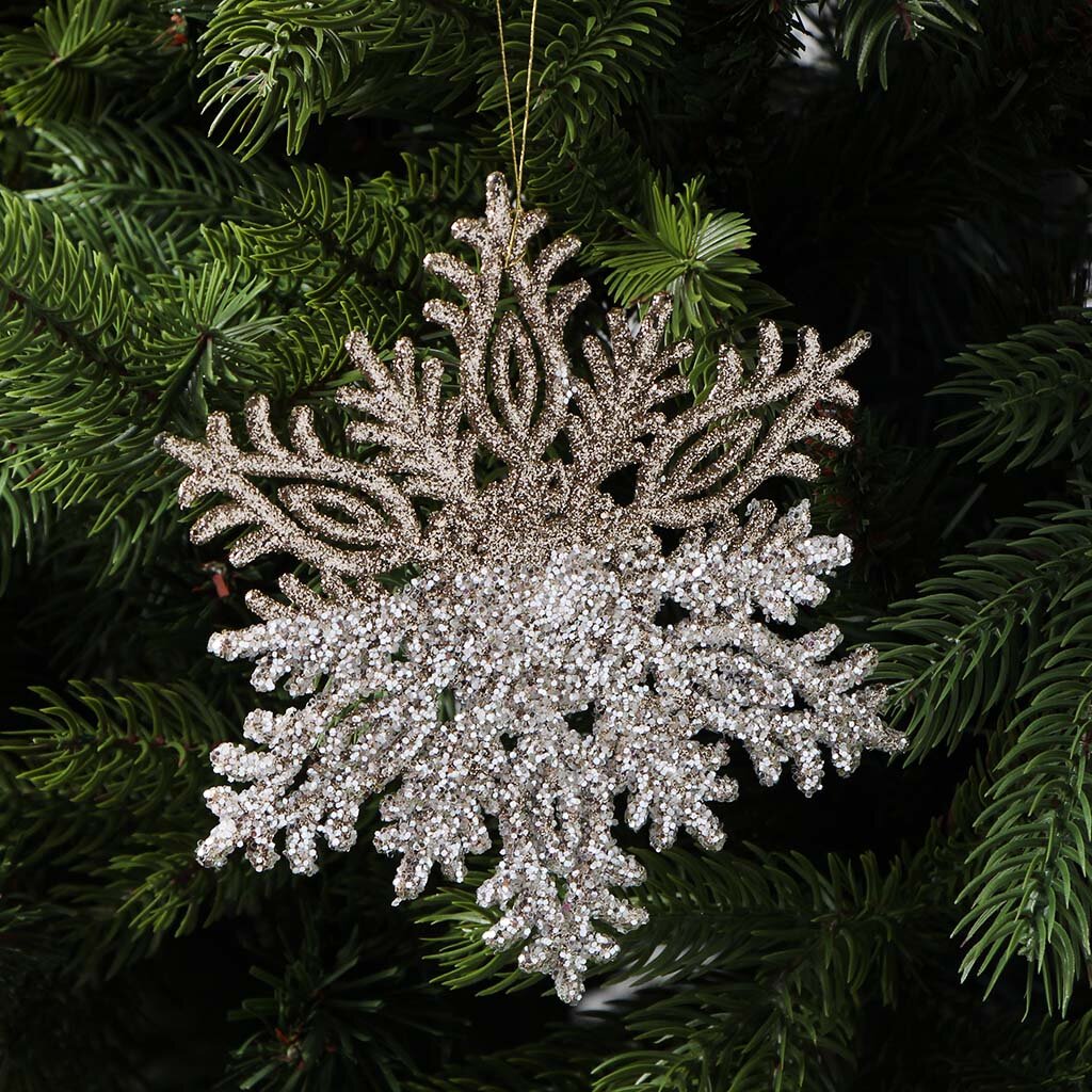 Диаметр украшения — 15 см, материал — пластик с блёстками. Благодаря этому снежинка подходит для уличной ёлки: не боится влаги, не выгорает на солнце, крепится на подвеске.