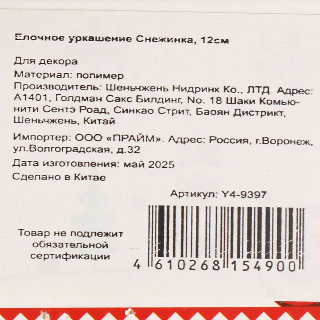 Елочное украшение «Снежинка» из пластика диаметром 12 см — это небьющийся декор, который отлично смотрится на елках любого размера. Белый цвет и блестящее покрытие создают эффект настоящего снега, а подвеска позволяет быстро и просто закрепить игрушку даже на уличных ветках. Благодаря прочному материалу снежинка выдерживает перепады температур и не теряет внешний вид — идеальное решение для тех, кто ищет, какую игрушку выбрать для дачи или детской комнаты.