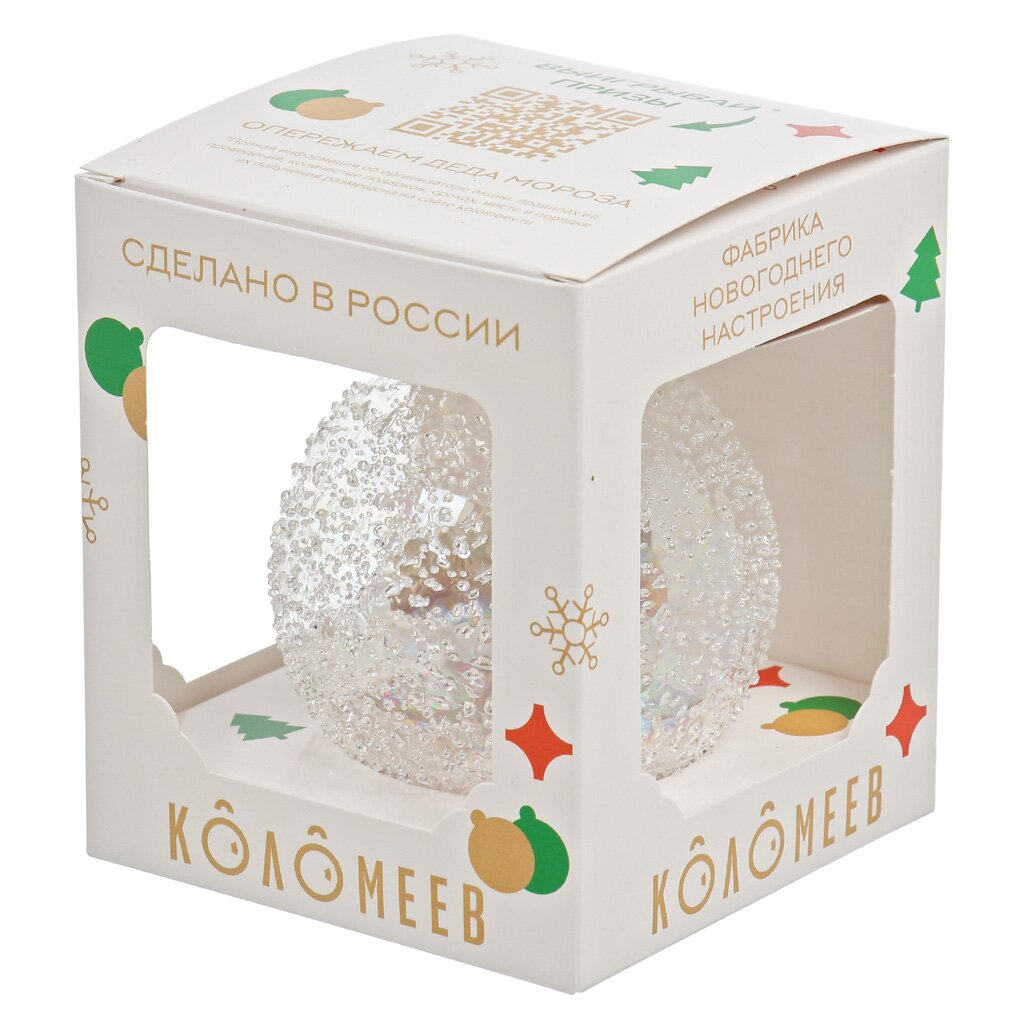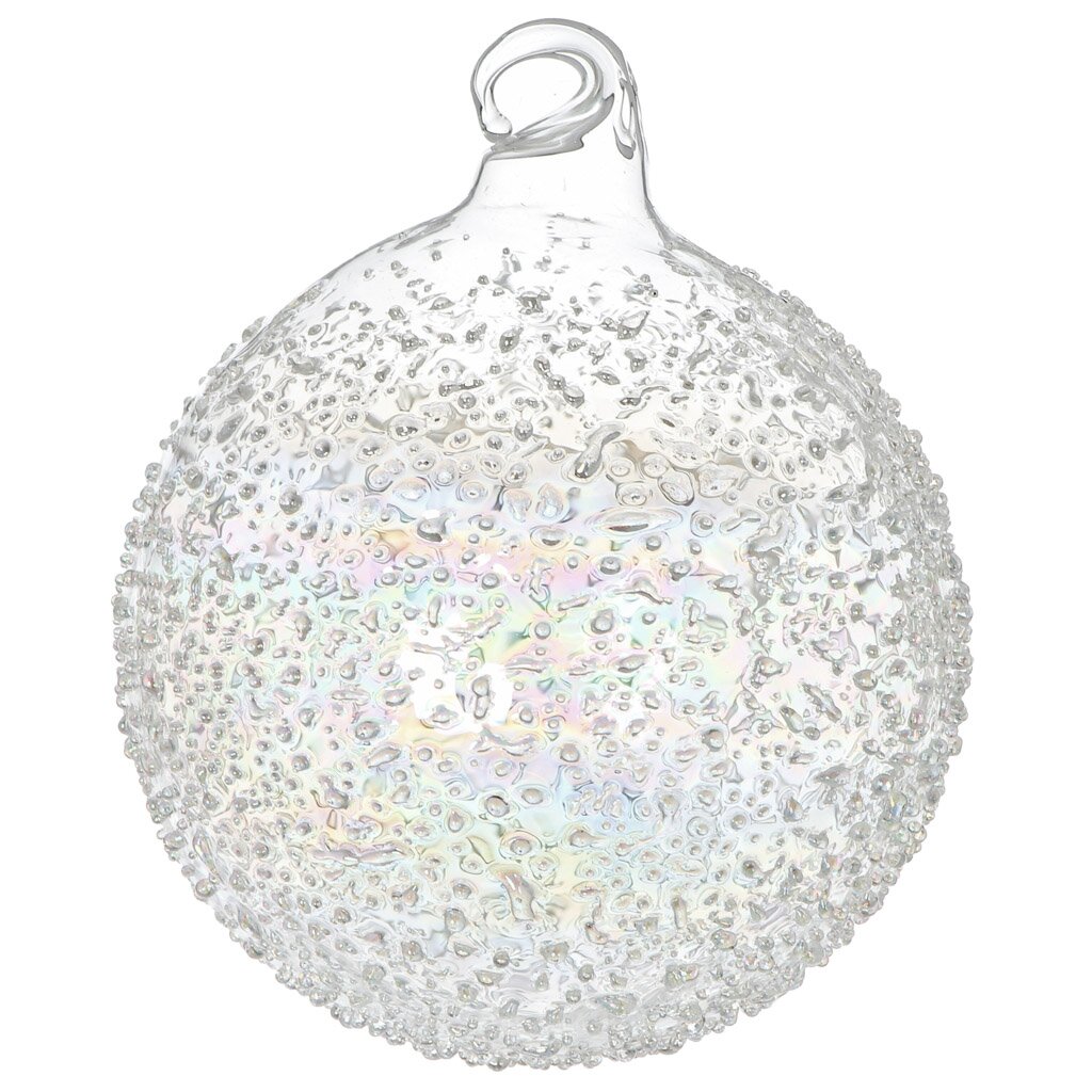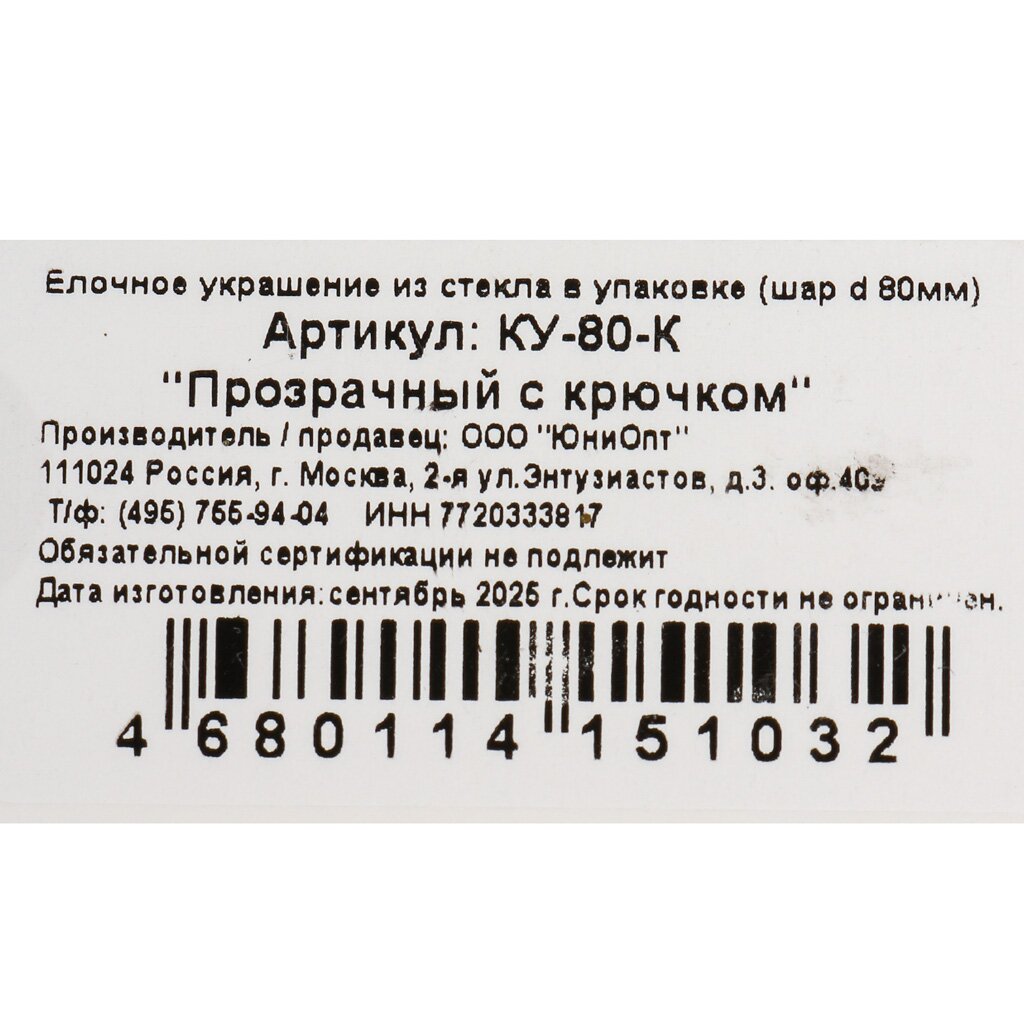 Шар оснащен надежным крючком для подвешивания и поставляется в индивидуальной коробке, что защищает его при хранении и транспортировке. Материал — стекло, диаметр — 8 см, цвет — прозрачный с блеском.