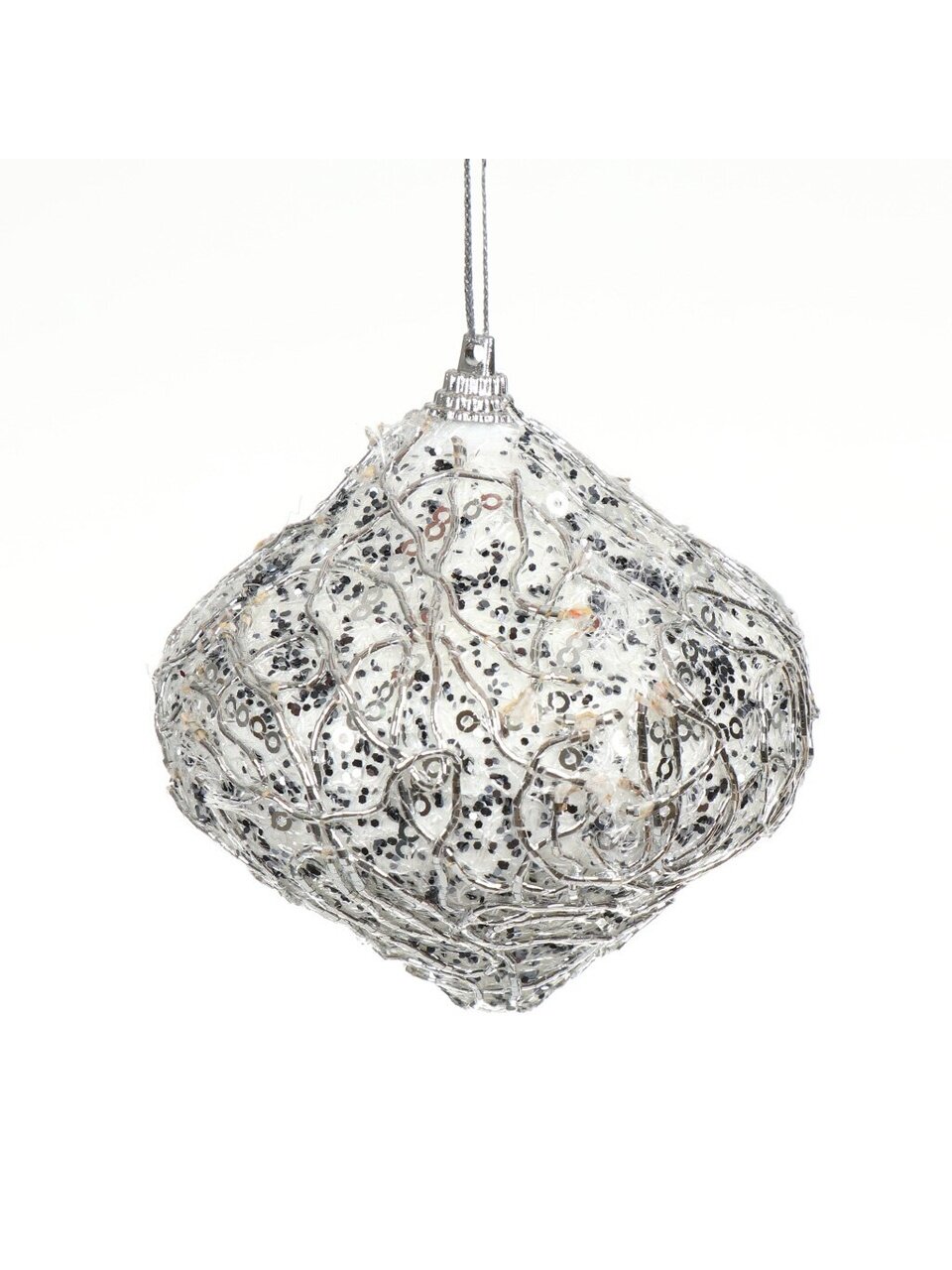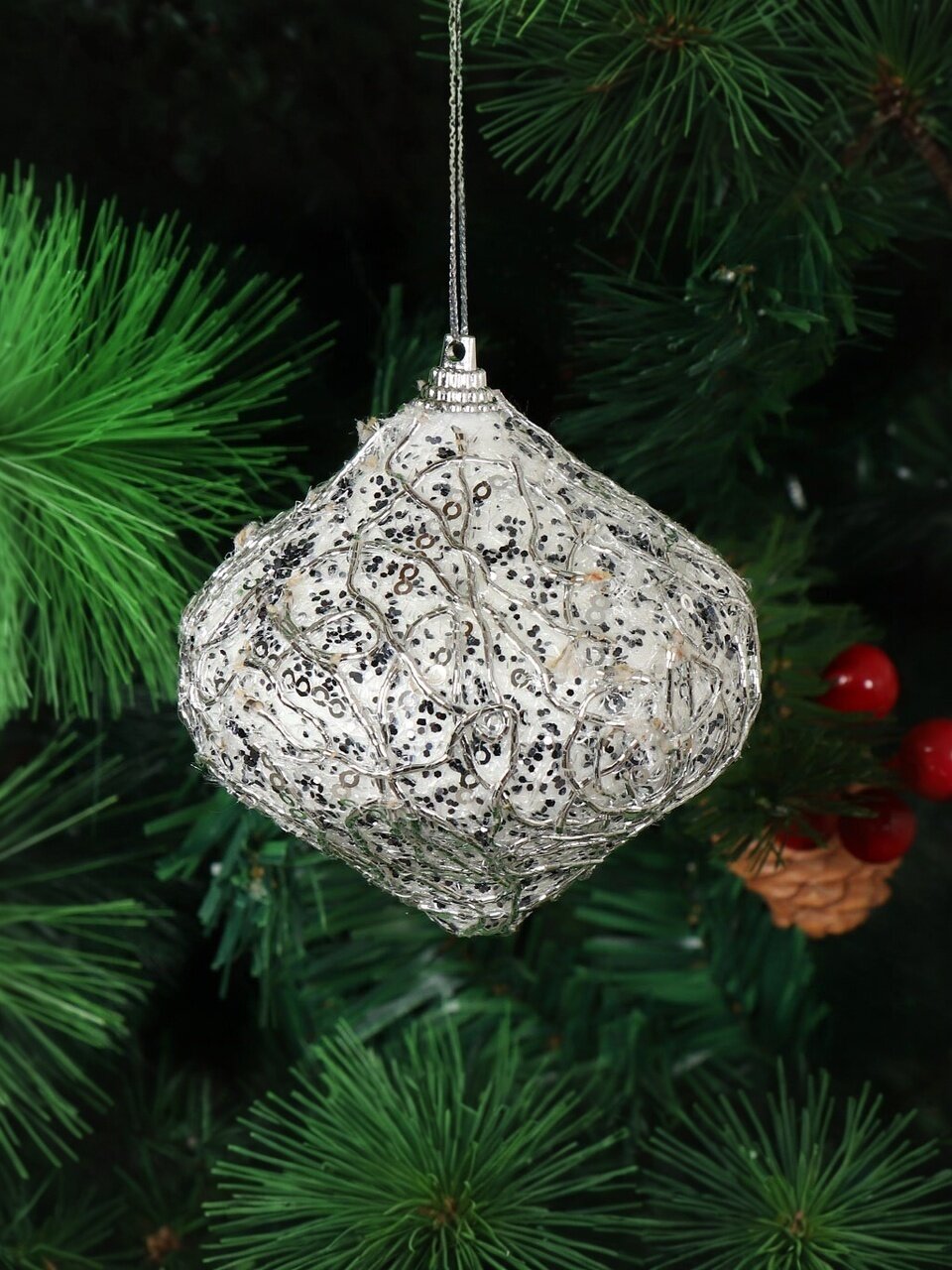 Диаметр — 8 см, цвет — серый однотонный с блестками, подходит для классических и современных елок любого размера.