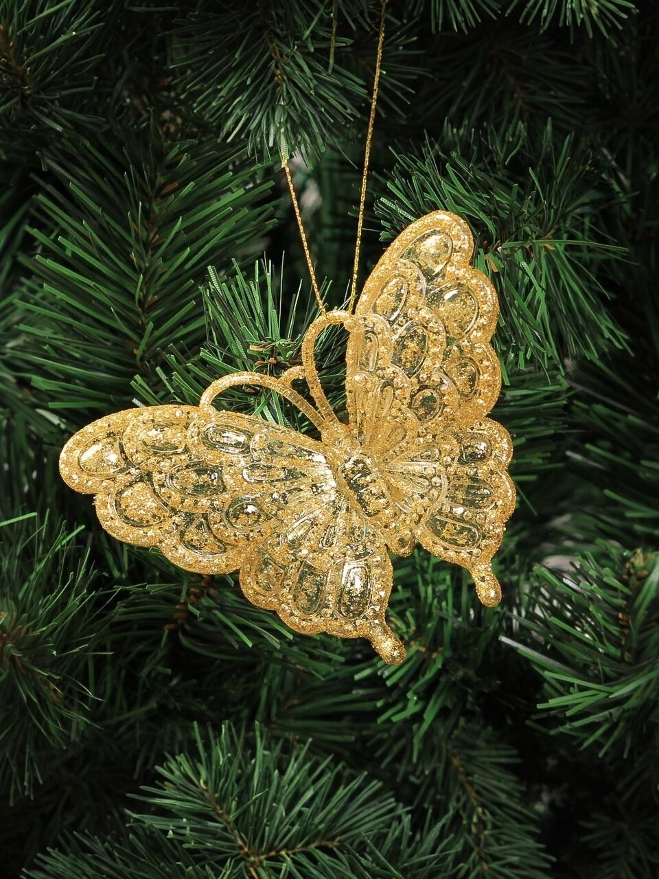 Эффектная елочная бабочка 12 см с золотым блеском: украсьте интерьер стильно, безопасно и недорого — идеальный акцент для дома, дачи, подарка.