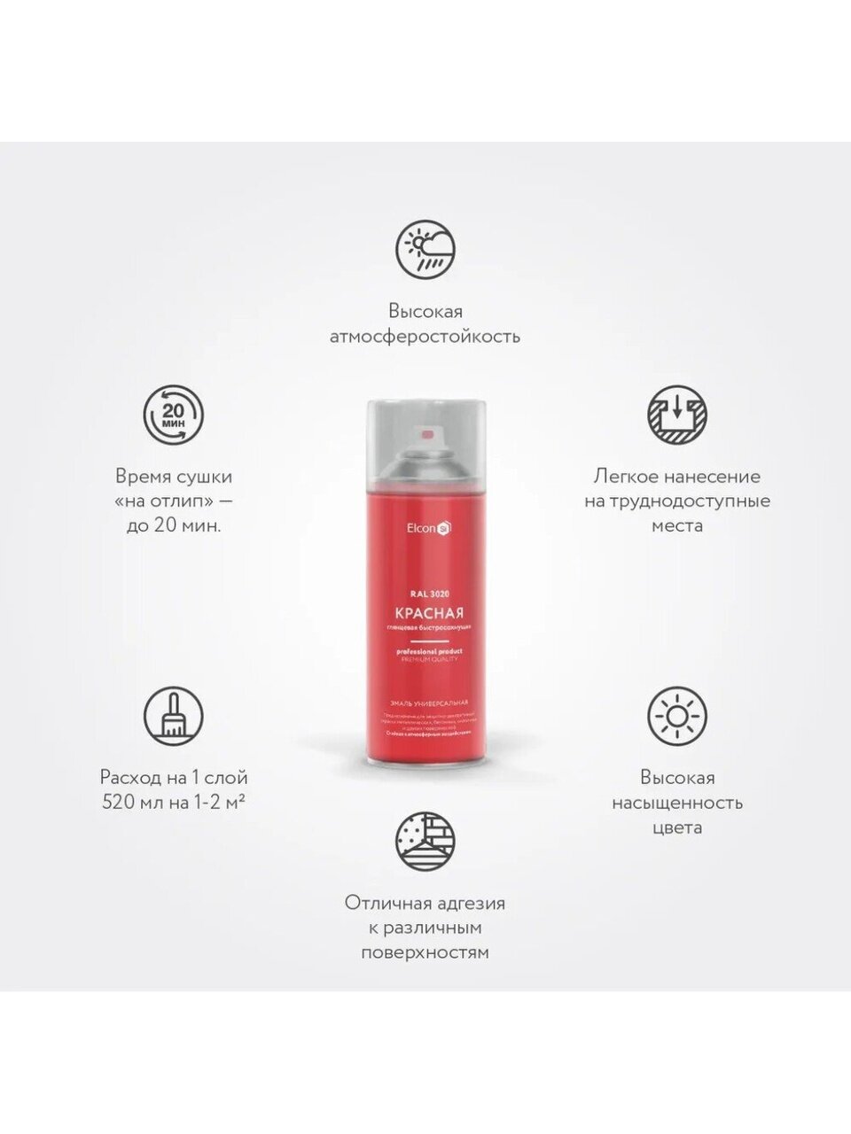Вы можете приобрести «Эмаль аэрозольная, Elcon, универсальная, быстросохнущая, акриловая, глянцевая, красная, RAL 3020, 520 мл» и другие товары в нашем интернет-магазине в Обнинске по низким ценам и с бесплатным самовывозом.