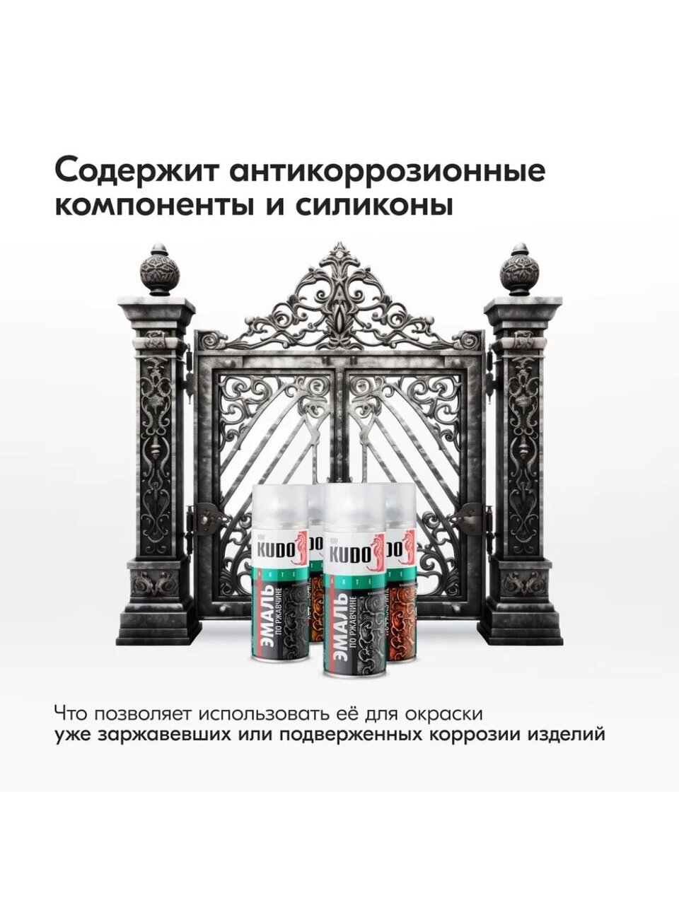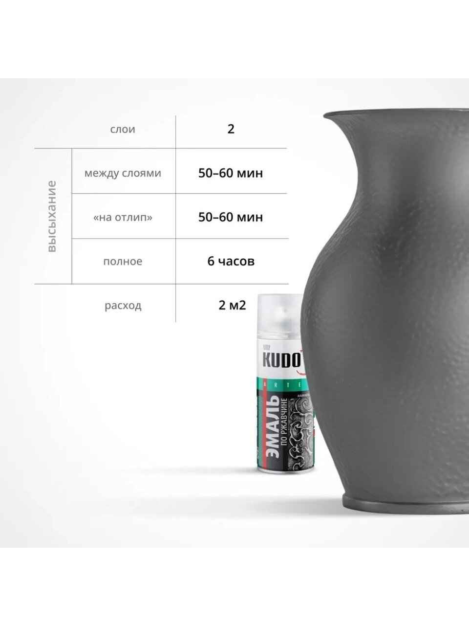 Высококачественная алкидная аэрозольная молотковая эмаль в баллончике KUDO предназначена для окраски уже заржавевших или подверженных коррозии изделий из сплавов черных металлов, а также для декоративной окраски предварительно загрунтованных деревянных, пластиковых и других поверхностей.